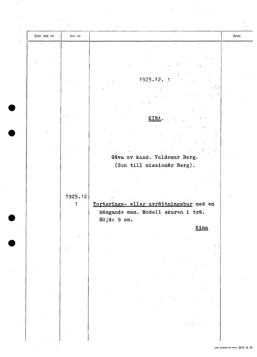 • 1925.12. 1 • KINA. Gåva av kand. Valdemar Berg. (Son till missionär Berg). 1925.12 1 Torterings- eller avrättningsbur med en hängande man. Modell skuren i trä. • Höjd: .9 cm. Kina [ocr]