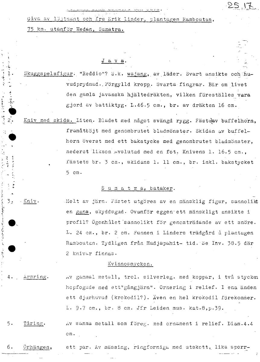 IS I Gåva av Htnant och fru Erik Linders plantagen Ramboutan, 75 km. utanför Medan, Sumatra. J a v a. 1 . Skuggspelsfigur. "Reddio"? S.k. yLI12.a.,6, av-läder. Svart ansikte ochllu- vudprydnad.:Förgylld kropp. Svarta.fingrar. Bär om livet den gamla javanska hjältedräkten, vilken föreställes vara gjord uv battiktyg. L.46.5 cm., br. av dräkten 16 cm. 2. Kniv med skida. Liten. Bladet med något svängd rygg. Fästav buffelhorn, framåtböjt med genombrutet bladmönster. Skidan av buffel- horn överst med ett bakstycke med genombrutet bladmönster, nederst liksom .avslutad med en fot. Knivens 1. 16.5 cm., fästets br. 3 cm., skidans 1. 11 cm., br. inkl. bakstycket 5 cm. Sumatra/ bataker. 3. - Kniv. elt av järn. Fästet utgöres av en mänsklig figur, sannolikt en gana, skyddsgud. Ovanför eggen ett mänskligt ansikte i profil? Ögonhålet sannolikt för gencmträdande av ett snöre. L. 24 cm., br. 2 cm. Funnen i Linders trädgård å plantagen Ramboutan. Tydligen från Madjapahit- tid. Se Inv. 38.5 där 2 knivar finnas. Kvinnosmycken. 4. Armring. Av gammal metall, trol. silverleg. med koppar, i två stycke]. hopfogade med etCgångjärn". Ornering i relief. 1 ena änden ett djurhuvud (krokodil?). Även en hel krokodil förekomMer. L. 9.7 cm., br. 8 cm. Jfr Leiden mus. kat.8,p.39. 5. Tåring. Äv samma metall som före. med ornament i relief. Liam.4.4 cm. 6. örhängen, ett par. Av mässing, ringformiga med utskott, lika sporr- _ _ [ocr]