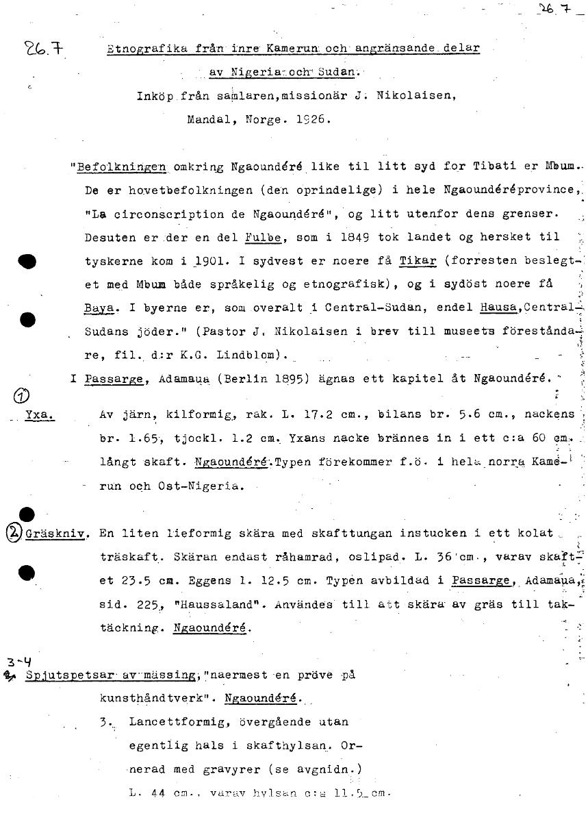Etnografika från inre' Kamerun, och angränsande delar av Nigeria-och-Sudan. Inköp från samlaren,missi.onär J. Nikolaisen, Mandal, Norge. 1926. "Befolkningen omkring Ngaound6r6like til litt syd for Tibati er Mbum.. De er ho.vetbefolkningen (den oprindelige) i hele Ngaound6r6province, "La circons.cription de Ngaound6r6", og litt utenfor dens grenser. Desuten er:der en del Fulbe, som i 1849 tok landet og hersket til tyskerne kom i_1901. I sydvest er noere få Tikar (forresten beslegt- et med Mbum både språkelig og etnografisk), og i sydöst noere få Baya. I byerne er, som_overalt i Central-Sudan, endel Hausa,Central. Sudans jöder." (Pastor J. Nikolaisen i brev till museets förestånda4 re, fil. d;r K.G. Lindblom). I Passarge, Adamaua (Berlin 1895) ägnas ett kapitel åt Ngaounderd. Yxa. Av järn, kilformig, rak. L. 17.2 cm., bilans br. 5.6 cm., nackens br. 1.65, tjockl. 1.2 cm. Yxans nacke brännes in i ett c:a 60 cm. . långt skaft. raaoundArf.Typen förekommer f.ö. i hela norra Kam4-' run och Ost-Nigeria. g)Gräskniv. En liten lieformig skära med skafttungan instucken i ett kolat träskaft. Skäran endast råhamrad, oslipad. L. 36"cm., varav skakt.2 • 12.5 i Passarge, , , et 23.5 cm. Eggens 1. cm. Typen avbildad Adamaua,f1 sid. 225, "Haussaland". Användes till att skära' av gräs till tak- täckning. Ngaounder6. 3^4 .40 Iplutspetsar-av-mässinai"naermest-en prdve på kunsthåndtverk". Ngaound6r. 3. Lancettformig, övergående utan egentlig hals i skafthylsan.. Or- •nerad med gravyrer (se avgnidn.) L. 44 cm-, varav hvisn c 11.5._cm. [ocr]