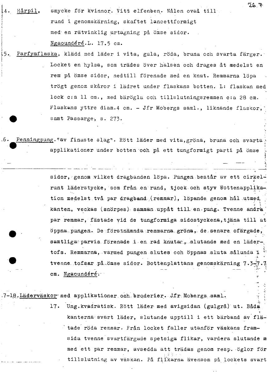 • . Hårpil, smycke för kvinnor. Vitt elfenben. Nålen oval till..- rund i genomskärning, skaftet lancettformigt med. en rätvinklig urtagning på ömse sidor. Ngaound4r4.L. 17.5 cm. 5. Parfymflaska, klädd m... Visa hela