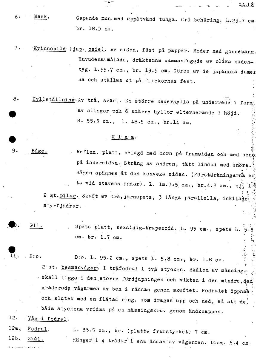 6 Mask. Gapande mun. med uppåtvänd tunga. Grå lehåring. L.29.7 cm, br. 18.3 cm. 7. Kvinnobild (jak. osie)_. Av siden, fäst på papper. Moder med gossebarn. Huvudena målade, dräkterna sammanfogade av olika siden- tyg. L.55.7 cm., br. 19.5 cm. Göres av de japanska damer na och ställas ut på flickornas fest. 8. Hyllställning:Av trä, svar*. En större nederhylla på underrede i form av slingor och 6 smärre hyllor alternerande i höjd. • H. 55.5 cm., 1. 48.5 cm., br.14 cm. K i' n a. • 9. _. Båge._ Reflex, platt, belagd med horn på framsidan och med sen6 på innersidan. Sträng av snören, tätt lindad med sndre. Bågen spännes åt den konvexa sidan. (Förstärkningarna bd: • ta vid stavens ändar). L. 1m.745 cm., br.4.2 cm., tj 1: 2 st.yilar. skaft av trä,järnspets, 3 långa parallella, inkilade]_ styrfjädrar. _ Spets platt, sexsidig-trapezoid. L. 95 em., spets L. 5.5 cm. br. 1.7 cm. • 11. D:o. D:o. L. 95.2 cm., spets L. 5.8 cm., br. 1.8 cm. 2 st. hessanyAgar-. I träfodral i två stycken. Skålen av mässingo • skall ligga i den större fördjupningen och vikten i den mindre,deh graderade .vågarmen av ben i rännan genom skaftet. Fodralet öppna-0 och slutes med en flätad ring, som drages upp. och ned, så att -de_ båda styckena vridas på en mässingskruv genom ändknappen. 12. Våg i fodral. 12a. Fodral. L. 35.5 cm., br. (platta framstycket) 7 cm. 12b. Skål. :Jänger i 4 trådar i ena ändan 'av vågarmen. Diam. 6.4 cm. [ocr]