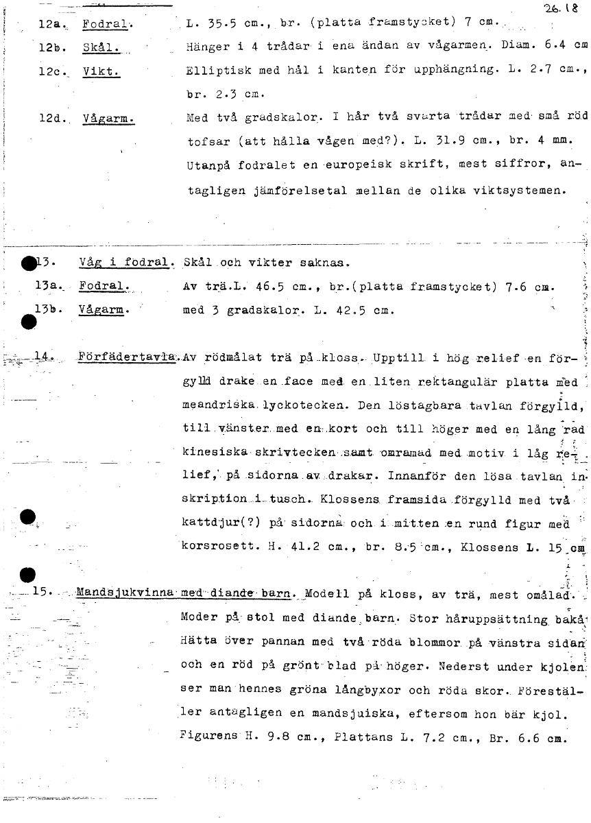 • 26. la 12a.. Fodral-. L. 35.5 cm., bl-. (platta framstycket) 7 cm.. 12b. Skål. Hänger i 4 trådar- i ena ändan av vågarmen. Diam. 6.4 cm 12c. Vikt. Elliptisk med hål i kanten för upphängning. L. 2.7 cm... Visa hela
