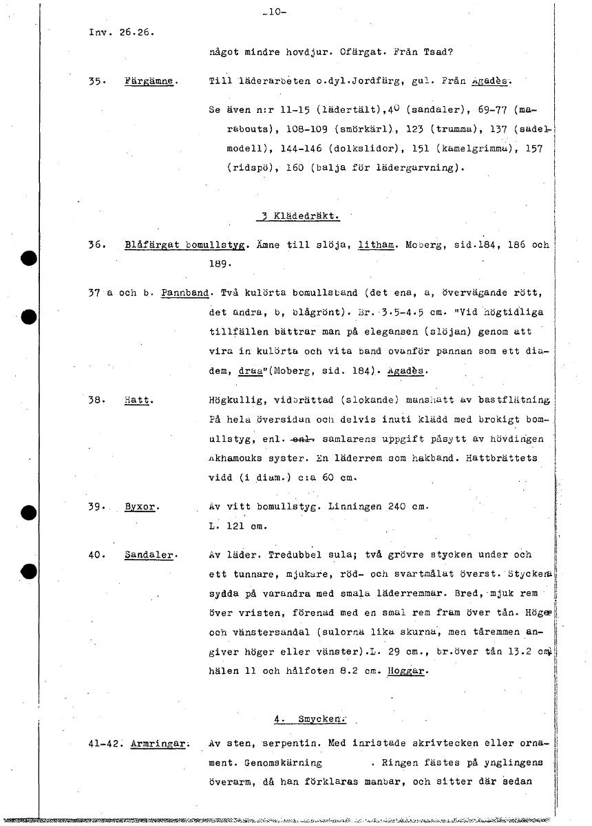 _1 Inv. 26.26. något mindre hovdjur. Ofärgat. Från Tsad? 35. Färgämne. Till läderarbeten o.dyl.Jordfärg, gul. Från eadhs; Se även n:r 11-15 (lädertält),40 (sandaler), rabouts), 108-109 (smörkär1), 123 (trumma), 137 (sadel- modell), 144-146 (dolkslidor), 151 (kamelgrimma), 157 (ridspö),• 160 (balja för lädergarvning). 3 Klädedräkt. 36. Blåfärgat bomullstyg. Ämne till slöja, litham. Moberg, sid.184, 186 och 189. b. Pannband. Två kulörta bomullsband (det'ena, a, övervägande rött, det andra, b, blågrönt). Br. 3.5-4.5 cm. "Vid högtidliga tillfällen bättrar man på elegansen (slöjan) genom att vira in kulörta och vita band ovanför pannan som ett dia- dem, draa"(Moberg, sid. 184). Agans. 38. Hatt. Högkullig, vidbrättad (slokande) manshatt av bastflätning.. På hela översidan och delvis inuti klädd med brokigt bom-. ullstyg, enl. -e-a-1 samlarens uppgift påsytt av höVdingen Akhamouks syster. En läderrem som hakband. Hattbrättets vidd (i diam.• c:a 60 cm. Byxor. bomullstyg. Linningen 240 cm. L. 121 cm. 40. Sandaler. Av läder. Tredubbel sula; två grövre stycken under och ett tunnare, mjukare, röd- och svartmålat överst. Styckena, sydda på varandra med smala läderremmar. Bred, mjuk rem över vristen, förenad med en smal rem fram över tån. Högom och vänstersandal (sulorna lika skurna, men tåremmen an- giver höger eller vänster).L. 29 cm., br.över tån 13.2 catt hälen 11 och hålfoten 8.2 cm. Hoggar. 4. Smycken.' 41-42. Armrinkar: Av sten, serpentin. Med inristade skrivtecken eller orna- ment. Genomskärning . Ringen fästes på ynglingens överarm, då han förklaras manbar, och sitter där sedan * [ocr]