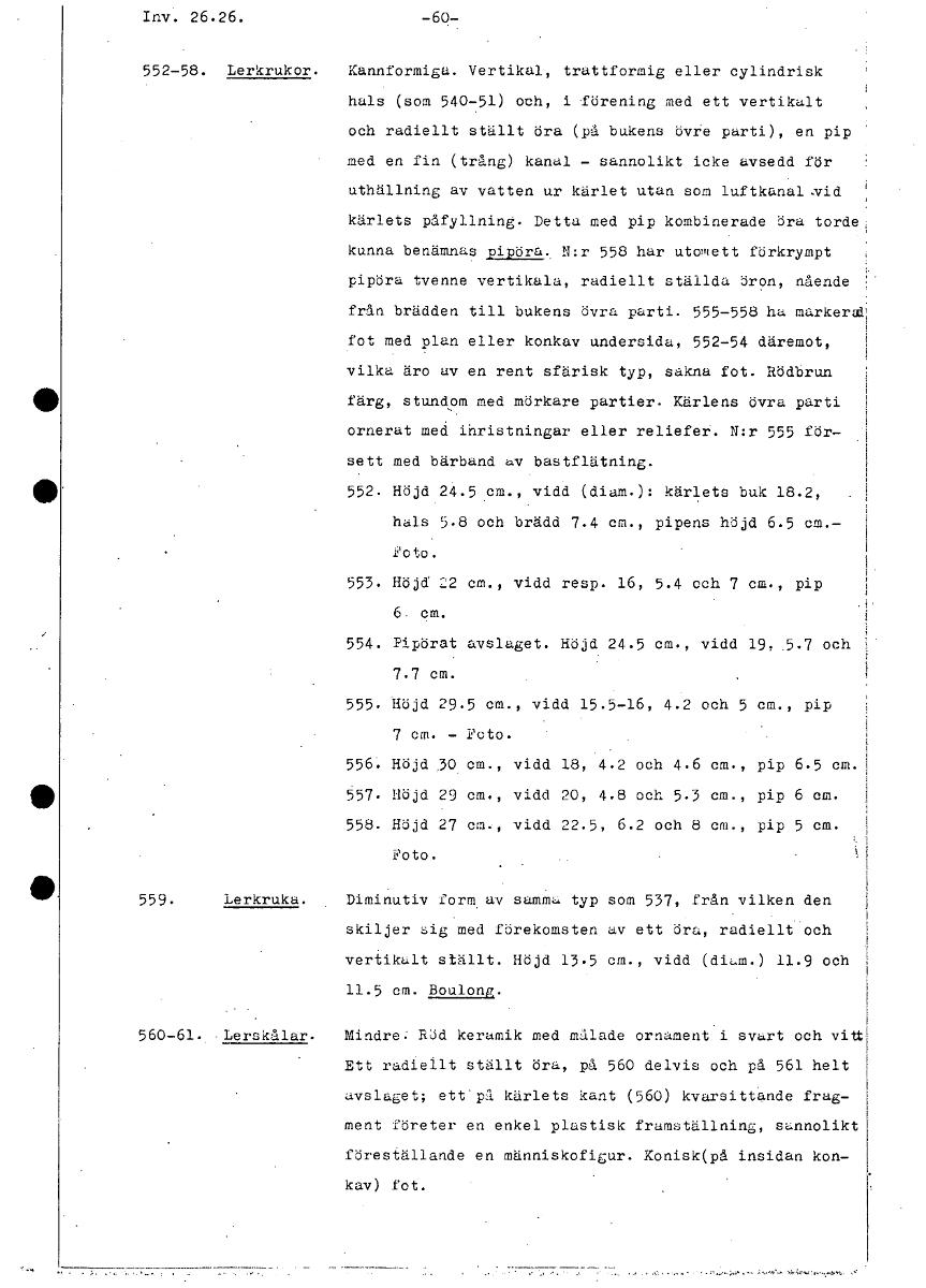 Inv. 26.26. -607 552-58. Lerkrukor. Kannformiga. Vertikal, trattformig eller cylindrisk hals (som 540-51) och, i förening med ett vertikalt och radiellt ställt öra (på bukens övre parti), en pip med en fin (trång) kanal - sannolikt icke avsedd för uthällning av vatten ur kärlet utan som luftkanal:vid kärlets påfyllning. Detta med pip kombinerade öra torde, kunna benämnas pipöra. N:r 558 har utomett förkrympt pipöra tvenne vertikala, radiellt ställda öron, nående från brädden till bukens övres parti. 555-558 ha markerad fot med plan eller konkav undersida, 552-54 däremot, vilka äro av en rent sfärisk typ, sakna fot. Rödbrun färg, stundom med mörkare partier. Kärlens öyra parti ornerat med inristningar eller reliefer. N:r 555 för- sett med bärband av bastflätning. 552. Höjd 24.5 cm., vidd (diam.): kärlets buk 18.2, hals 5.8 och brädd 7.4 cm., pipens höjd 6.5 cm.- Foto. 553. Höjd 22 cm., vidd resp. 16, 5.4 och 7 cm., pip 6. cm. 554. Pipörat avslaget. Höjd 24.5 cm., vidd 19, .5.7 och 7.7 cm. 555. Höjd 29.5 cm., vidd 15.516, 4.2 och 5 cm., pip 7 cm. Foto. 556. Höjd 30. cm., vidd 18, 4.2 och 4.6 cm., pip 6.5 cm. 557. Höjd 29 cm., vidd 20, 4.8 och 5.3 cm., pip 6 cm. 558. Höjd 27 cm., vidd 22.5, 6.2 och 8 cm., pip 5 cm. Foto. 559. Lerkruka. Diminutiv form av samma. typ som 537, från vilken den skiljer sig med förekomsten av ett öra, radiellt och vertikalt ställt. Höjd 13.5 cm., vidd (diam.) 11.9 och 11.5 cm. Boulonp. 560-61. .Lerskålar. Mindre: Röd keramik med målade ornament i svart och vitt Ett radiellt ställt öra, på 560 delvis och på 561 helt avslaget; ett. på kärlets kant (560) kvarsittande frag- ment företer en enkel plastisk framställning, sannolikt föreställande en människofigur. Konisk(på insidan kon- kav) fot. [ocr]
