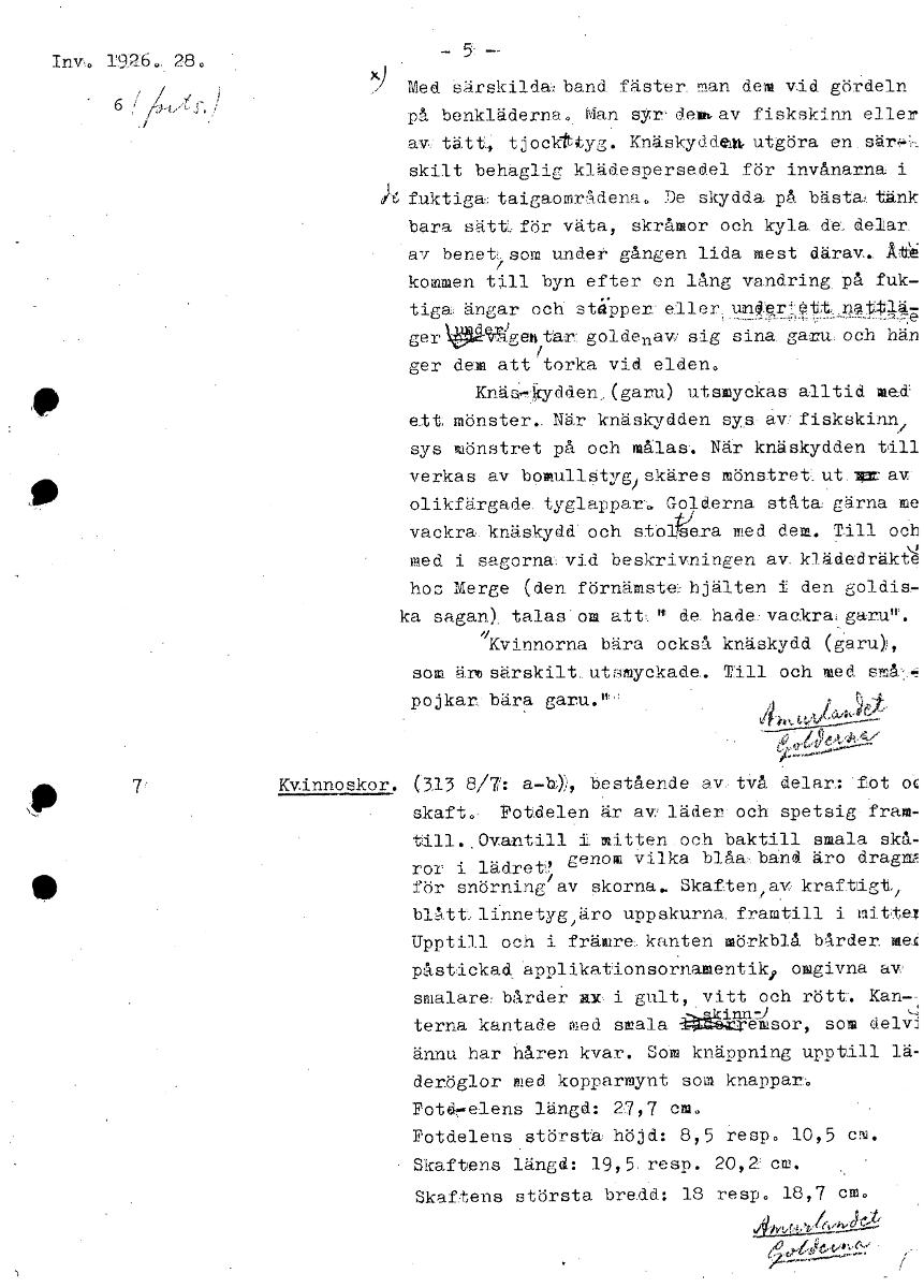 1926., 28. - 5: -- x) Med åärskilda band fäster. man dem vid gördeln på benkläderna. Man syr:demav fiskskinn eller. av tätt tjock- tyg. Knäskydden. utgöra en.särf,,:, skilt behaglig klädespersedel för invånarna i fuktiga, taigaområdena. De skydda på bästätänk bara sättLför väta, skråmor och kyla. da delar. av benet som under gången lida mest därav.. ÅHÅ 7 kommen till byn efter en lång vandring, på fuk- tiga ängar och stäPper:allerylnftrtt,,natnäg ger dWgentar:goldenaw sig sina. gara: och hän ger de att torka vid elden. Knäs-Tkydden(garu) utsmyckas- alltid mad att mönster.. När knäskydden sys.• av: fiskskinn/ sys mönstret på och målas. När knäskydden till verkas av bomullstygs skäres mönstretut.wraw olikfärgade. tyglappar-. Golderna ståta: gärna me vackra knäskydd. och stolVara med dem. Till och ned i sagorna: vid beskrivningen av. klädadräkte‘2. hos Merge (den. förnämstahjälten i den goldis, ka sagan). talas'om at-t" de. hadavackra:garu". Kvinnorna bära också knäskydd (garuY, som ärbsärskilt_utsmyckade- Till och med pojkar:bära garu."'' Kvinnoskor. (3.13 8/1: a-b,), bestående avtvå delar:.fot oe skaft.- Fotdelen är av, läder. och spetsig- fram- till. Ovantill mitten.och baktill smala skå- i genom vilka blåa. band äro dragni ror lädret, för snörninglav skorna. Skaften/ av. kraftigt/ blåttlinnetyg,äro uppskurna. framtill i mittel Upptill och i främrekanten mörkblå bårder. påstickad applikationsornakentik, omgivna av, smalare: bårder mc i gult, vitt och rött. Kan-- tema kantade med smalare sor, som delv] ännu har håren kvar. Som knäppning upptill lä- deröglor med kopparmynt som knappar. Fotd-relens längd: 27,7 cm. Fotdelens största höjd: 8,5 resp. 10,5 civ. Skaftens längd: 19,5. resp. 20,2 cm. Skaftens största bredd: 18 resp. 18,7 cm. 2.1.4 6, [ocr]