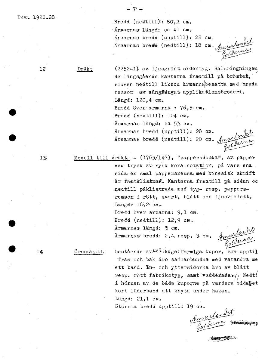 -77-- 1926..28-, Bredd (nedtill);: 80.1,2 Ärmarna 8: längd: ca 41 cm. Ärmarnas bredd (upptill): 22 cia Ärmarnas bredd (nedtill): 18 cm 12' Dräkt (2252-1) av ljusgrönt sidentyg. Halsringningen de längsgående kanterna framtill på bröstat, sömmen nedtill liksom ärmarnaKesatta med hreda remsor aw mångfärgat applikationsbroderi. Längd: 120,4: cm. Bredd över armarna : 76r5 ca. Bredd (nedtill): 104 cm. Ärmarnas längd: ca. 53 cm. Ärmarnas bredd (upptill): 28 cm. %); Ärmarnas bredd (nedtill): 20 cm. 24 4v 131 Modell till dräkt. - (1765/147), "pappersdocka),', av: papper med tryck avi rysk koralnotation, på vars ena. sidaen smal pappersremsa med kinesisk skrift är fastklistnÅ..Kanterna. framtill på. sidan oc nedtill påklistrade:ed tyg- resp. pappors— remsor' i rött:I:svart,. blått och ljusviolett. Längd:: 1M: Cm., Bredd över armarna: 9,1 cm. Bredd (nedtill): 12,9 CP> Ärmarna&längd: 3 cm. Ärmarnas' bredd: 2,4, resp. cm. 4 ,,,....._-, : ,.......„ ,•,.. ,,„,„.,- • 14 Öronskydd, bestående avtv4 kägelformiga kupor, SOM upptil fram och bak äro samalanbundna med varandra me ett band. In- och yttersidorna äro av blått resp. rött fabrikstyg, samt vadderade,yi; Nedti i hörnen av de båda kuporna på vardera sidaet kort läderband att knyta under hakan. Längd: 21,1 cm. Största bredd upptill: 19 cm. , :0 c-,-/ (Niktmattkkoet5 [ocr]
