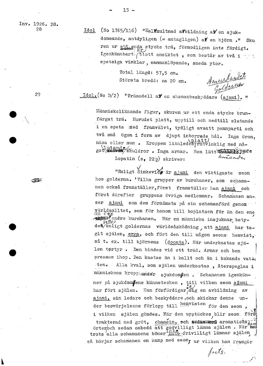 13- Inv. 1926. 28. 28 Idol (No 1765/116) "HalYmultnad avbildning allen sjuk- domsande, antdyligen (= antagligen) aY en björn ." Sk• ren ur-It.pInaa stycke :trä, förmodligen inte färdigt. ar'.)- Igenkä...