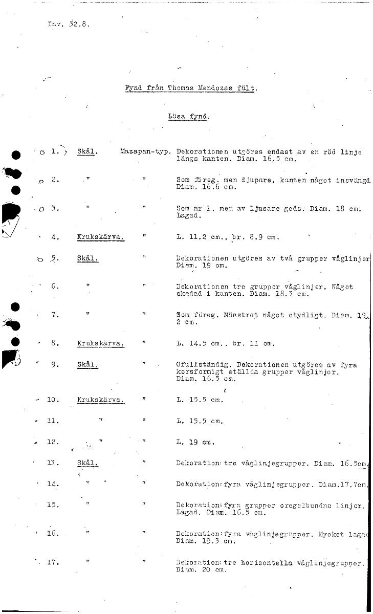 Fynd från Thomas Mendozas fält. Lösa fynd. • O 1. 7 Skål. Mazapan-typ. Dekorationen utgöres endast av en röd linje längs kanten. Diam. 16,5 cm. Som fireg. men djupare, kanten något insvängd, Diam. 16.6 cm. Som nr 1, men av ljusare gods: Diam. 18 cm. Lagad. 4. Krukskärva. L. 11.2 cm., br. 8.9 cm. Skål. Dekorationen utgöres av två grupper våglinjer Diam. 19 cm. - G. Dekorationen tre grupper våglinjer. Något skadad i kanten. Diam. 18.3 cm. Som föreg. Mönstret något otydligt. Diam. 2 cm. II 8. Krukskärva. L. 14.5 cm., br. 11 cm. Pr- -'"-‘) 0 f . Skål. Ofullständig.. Dekorationen utgöres av fyra korsformigt ställda grupper våglinjer. Diam. 16.5 cm. - 10. Krukskärva. L. 15.5 cm. L. 15.5 cm. e, 12. L. 19 cm. 15. Skål. Dekoration: tre våglinjegrupper. Diam. 16.5cm. Dekoration; fyra våglinjegrupper. Diam.17.7cm, IT TT Dekoration: fyra grupper, oregelbundna linjer. Lagad. Diam. 16.5 em. TT TT Dekoration:fyra våt linjegrupper. Mycket laga( Diam. 19.3 Ekoration: tre horisontella våglinjegruppor. Diam. 20 em. [ocr]