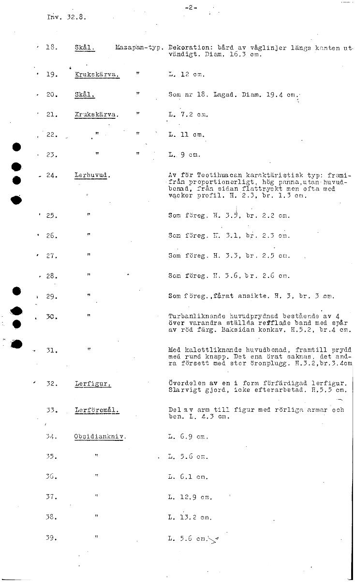 -2- Inv. 32.8. • 18. Skål. Mazapän-typ. Dekoration: bård av våglinjer längs kanten ut. vändigt. Diam. 16.3 cm. • 19. Krukskärva. L. 12 cm. • 20. Skål. Som nr 18. Lagad. Diam. 19.4 cm.• ' 21. Krukskärva. L. 7.2 cm. L. 11. cm. L.. 9 cm. • 24. Lerhuvud. Av för Teotihuacan karaktäristisk typ: frami- från proportionerligt, hög panna,utan.huvud- bonad, från sidan flatt•yekt men ofta med vacker profil. H. '2.3, br. 1.3 cm. ' 25. Som föreg. H. 3J, br. 2.2 cm. • 26. Som föreg. E. 3.1, br. 2.3 cm. 1 27. Som föreg. H. 3.3, br. 2.5 cm. • 28. Som föreg. H. 3,6, b r. 2.6 cm. 29. Som föreg. ,fårat ansikte. H. 3, br. 3 em. , 30. Turbanliknande huvUdprydnad bestående av över varandra ställda refflade band med spår av röd färg. Baksidan konkav. H.5.2, br.4 cm. 31. Med kalottliknande huvudbonad, framtill prydd med rund knapp. Det ena örat saknas, det and-, ra försett med stor öronplugg. H.3.2,br.3.4cm ° 32. Lerfigur. Överdelen av en i form förfärdigad lerfigur. Slarvigt gjord, icke efterarbetad. 11.5.5 cm. 33. Lerföremål. Del av arm till figur med rörliga armar och ben. L. 4.3 cm. 34. Obsidiankniv. L. 6.9 on. L. 5.6 cm. L. 6.1 cm. L. 12.9 om. L. 13.2 cm. L. 5.6 cm. [ocr]