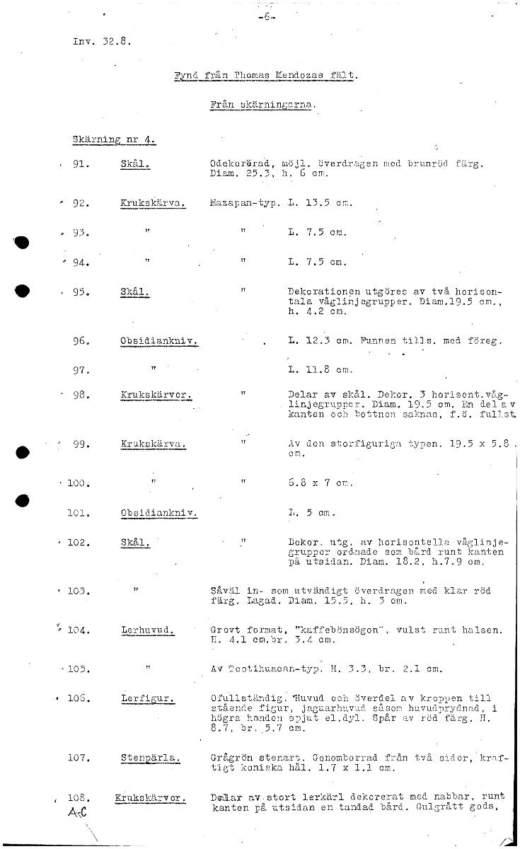 Inv. 32.8. Fynd från Thomas Mendozas fält. Frår sk:g....rningarna. Skärning nr Skål. Odekorörad, möjl. överdragen med brunröd färg. Diam. 25.3, h. G cm. Krukskärva. Mazapan-typ. L. 13.5 cm. 93. TT L. 7.5 om. ° 94. L. 7.5 cm. Skål. Dekorationen utgöres av två horison- tala våglinjegrupper. Diam.19.5 cm., h. 4.2 cm. Obsidiankniv. L. 12.3 cm. Funnen tills. med föreg. L. 11.8 cm. krukskärvor. Delar av skål. Dekor. 3 horisont.våg- linjegrupper. Diam. 19.5 cm. En delav kanten och bottnen saknas, f.ö. :full st. Krukskärva. Av den storfiguriga typen. 19.5 x 5.8 . cm. 100 6.8 x 7 cm. • 101 Obsidiankniv. L. 5 cm. • 102. Skål. Dekor. utg. av horisontell). wklinje- grupper ordnade som bärd runt kanten på utsidan. Diam. 18.2, h.7.9 cm. 1G3. Såväl in- som utvändigt överdragen med klar röd färg. Lagad. Diam. 15.5, h. 3 cm. Lerhuvud. Grovt format, "kaffebönsögon-, vulst runt halsen. H. 4.1 em.br. 3.4 cm. Av Teotihuacan-typ. H. 3.3, br. 2.1 cm. 0 Ofullständig. 'Huvud och överdel av kroppen till stående figur, jaguarhuvud såsom huvudprydnad, i högra handen spjut el.dyl. Spår av röd färg. H. 8.7, br. 5.7 em. Stencärla. Grågrön stenart, Genomborrad från två sidor, krrlf- tigt koniska hål. 1.7 x 1.1 om. , Krukskärv o Dalar av.stort lerkärl dekorerat med nabbar, runt kanten på utsidan en tandad bård. Gulgrått gods, [ocr]