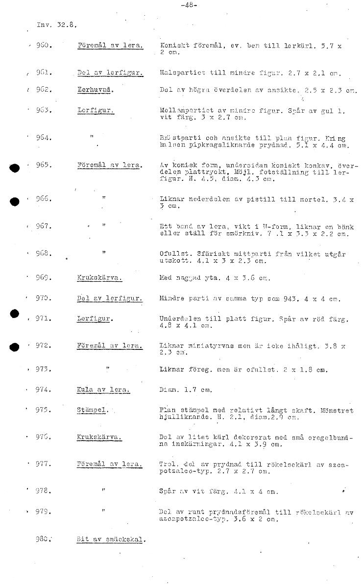 • Inv. 32.8. • 960. Föremål av lera. Koniskt föremål, ev. ben till lerkärl. 5.7 x 2 em. 961. Del av lerfiour. halspartiet till mindre figur. 2.7 x 2.1 t 962. Lerhuvud, Del av högra överdelen av ansikte.... Visa hela