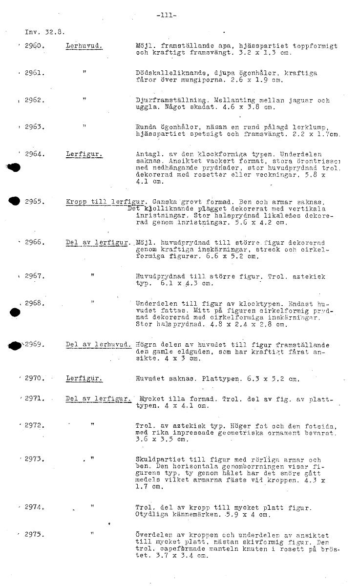 Inv. 32.i. 2960. Lerhuvud. Möjle framställande apa, hjässpartiet toppformigt och kraftigt framsvängt. 3.2 x 1.3 om. 2961. Dödskalleliknande, djupa ögonhålor, kraftiga fårar över mungiporna. 2.6 x 1,9 -me 2962. Djurframställning. Mellanting mellan jaguar och uggla. Något skadat. 4.6 x 3.8 cm. Runda ögonhålor, näsan en rund pålagd lerklump, hjässpartiet spetsigt och framsvängt. 2.2 x 1.7cm. 2964. Lerf115.2., Antagl. av den klockformiga typen. Underdelen saknas. Ansiktet vackert format, stora örontrisso] 101, med nedhängande prydnader, stor huvudprydnad trol, dekorerad med rosetter eller veokningar. 5.8 x 4.1 cm. • 2965. Kro till lerfigur. Ganska grovt formad. Ben och armar saknas. Det .kjolliknande plagget dekorerat med vertikala lnristningar. Stor halsprydnad likaled-es dekore- rad genom inristningar. 5.6 x 4.2 cm. - 2966. Del av 1erfiur.huvudprydnad till större figur dekorerad genom kraftiga inskärningar, streck och cirkel- formiga figurer. 6.6 x 5.2 om. 2967. Huvudprydnad till större figur. Trol. aztekisk typ. 6,1 x.4.3 cm. • 2968. TT Underdelen till figur av klocktypen. Endast hu- vudet fattas. Mitt på figuren cirkelformig p/nrd- nad dekorerad med cirkelformiga inskärningar. Stor halsprydnad. 4.8 x 2.4 x 2.8 cm. 1111W2969. Del av lerhuvud. Högra delen av huvudet till figur framställande den gamle eldguden, som har kraftigt fårat an- sikte. 4 x 3 cm. • 2970 1.212:1111.1, Huvudet saknas, Plattypen. 6.3 x 5.2 cm. • 2971. Del av lerflGur. Mycket illa formad. Trol. del av fig. av platt- typen. 4 x 4.1 cm. • 2972. Trol. av aztekisk typ. Höger fot och den fotsida, med rika inpressade geometriska ornament bevarat. 3.6 x 3.5 cm. • 2973. Skuldpartiet till figur med rörliga armar och ben. Den horisontala genomborrningen visar fi- gurens typ, ty genom hålet har det snöre gått medels vilket armarna fästs vid kroppen. 4.3 x 1.7 cm. 2974. Trol. del av kropp till mycket platt figur. Otydliga kännemärken. 5.9 x 4 cm. 2975. Överdelen av kroppen och underdelen av ansiktet till mycket platt, nästan skivformig figur. Den trol. capeförmade manteln knuten i rosett på brös- tet. 3.7 x 3.4 cm. [ocr]