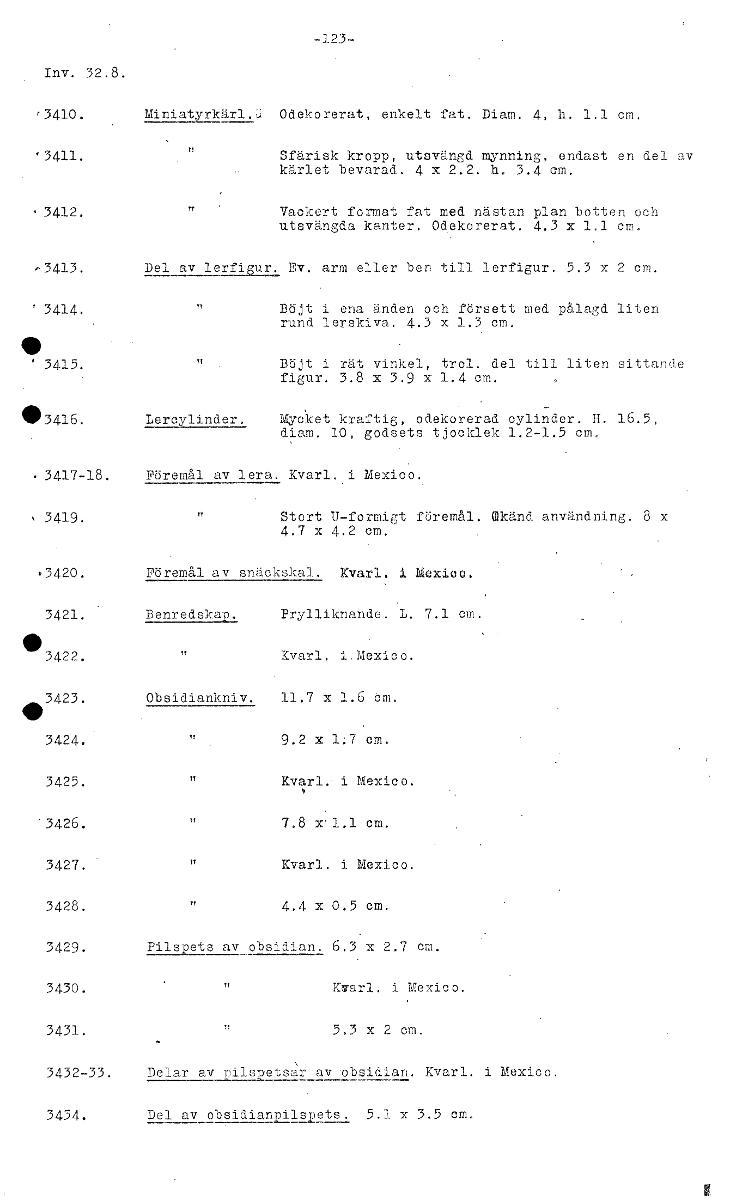 -123- Inv. 32.8. 3410. Miniatyrkärl.0 Odekorerat, enkelt fat. Diam. 4, h. 1.1 cm, 43411. Sfärisk kropp, utsvängd mynning, endast en del av kärlet bevarad. 4 x 2.2. h. 3.4 cm. 3412. n Vackert format fa...