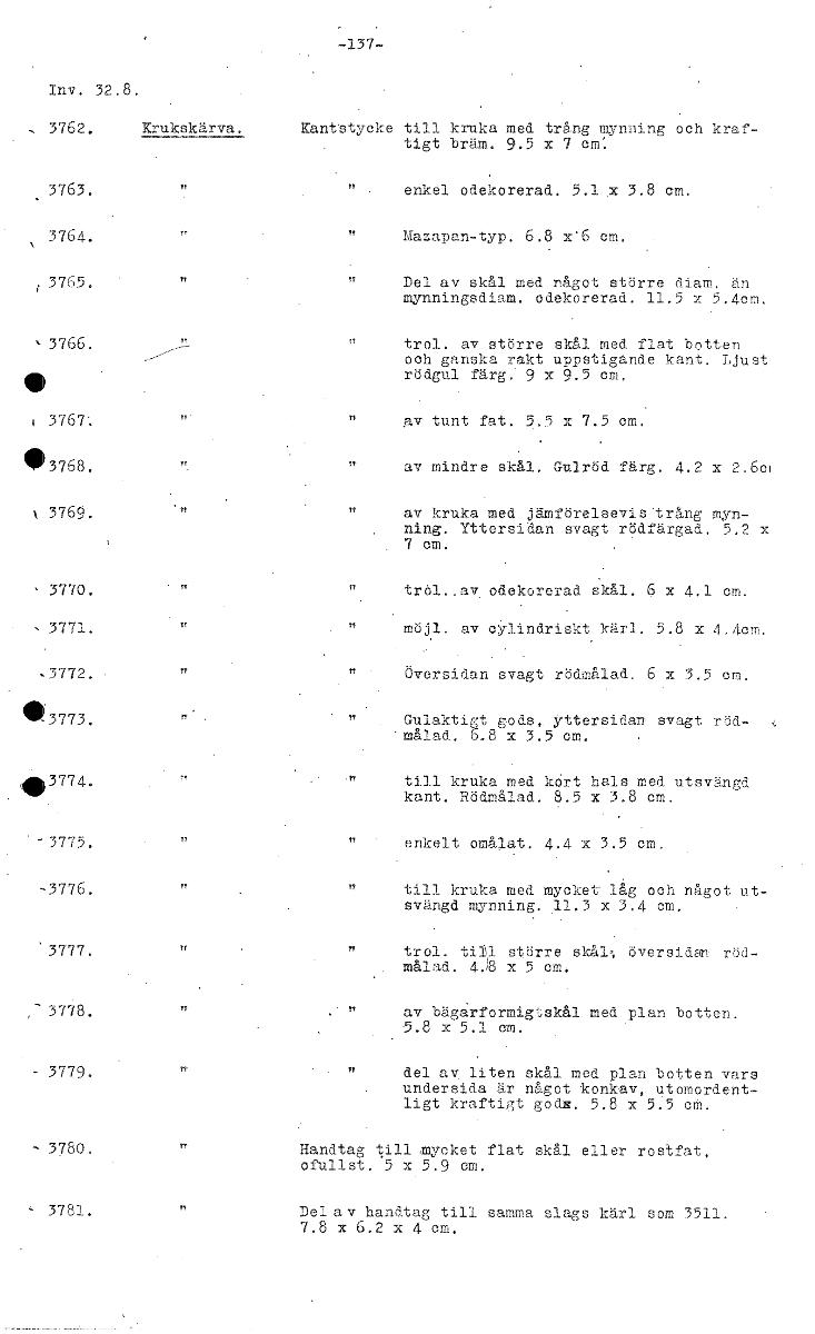 -137- Inv. 32.8. , 3762. Krukekärva, Kantstycke till kruka med, träng mynning och kraf- tigt bräm. 9.5 x 7 °ml 3763. enkel odekorerad. 5.1 x 3.8 cm. 3764. Ma.7,1 , typ. 6.8 x'6 cm. ( -3765° Del av skå...