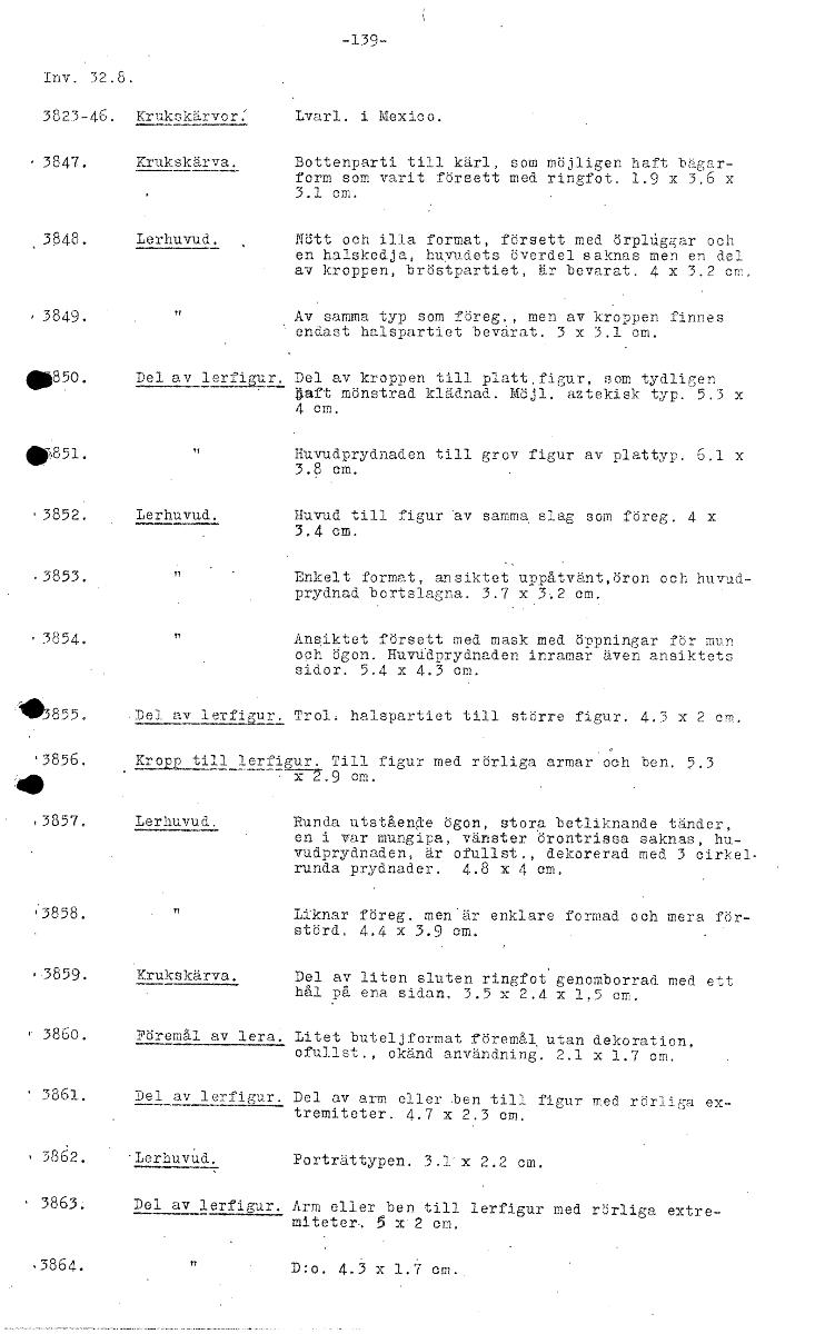 -139- Tv . 32.8. 382346. Krukskärvor: Lvarl. i Mexico. • 3847. Krukskärva. Bottenparti till kärl, som möjligen haft bägar- form som varit försett med ringfot. 1.9 x 3.6 x 3.1 cm. 3848. Lerhuvud. Nött ...