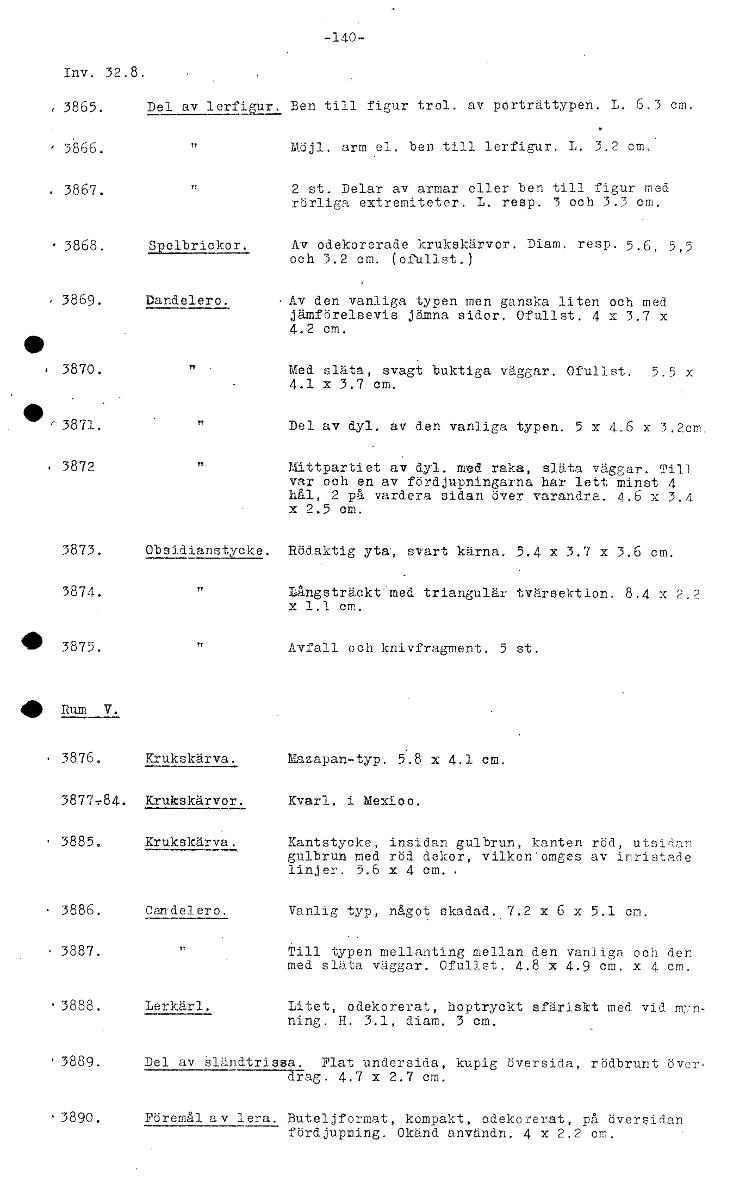 -140- Inv. 32.8. , 3865. Del av lerfigur. Ben till figur trol. av pörträttypen. L. 6.3 cm. 3866. Möjl.•arm el. ben till lerfigur. L. 3.2 cm, • 3867. TT 2 st. Delar av armar eller ben till figur med rörliga extremiteter. L. resp. 3 och 3.3 cm. • 3868. Spelbrickor. Av odekorerade krukskärvor. Diam. resp. 5.6, 5,5 och 3.2 cm. (ofUlist.) . 3869. Dandelero. ,Av den vanliga typen men ganska liten och med jämförelsevis jämna sidor. °fullst. 4 x 3.7 x 4.2 cm. • 3870. Med släta, svagt buktiga väggar. °fullst. 5.5 x 4.1 x 3.7 cm. • (‘ 3871. Del av dyl. av den vanliga typen. 5 x 4.6 x 3.2cm 3872 Mittpartiet av dyl. med raka, släta väggar. Till var och en av fördjupningarna har lett minst 4 hål, 2 på vardera sidan över varandra. 4,6 x 3.4 x 2.5 cm. 3873. Obsidianstycke. Rödaktig yta, svart kärna. 5.4 x 3.7 x 3.6 cm. 3874. Tt Långsträckt'med triangulär tvärsektion. 8.4 x 2.2 x 1.1 cm. • 3875. tt Avfall och knivfragment. 5 st. 41, Rum V. 3876. Krukskärva. Mazapan-typ. 5.8 x 4.1 cm. 3877.84. Krukskärvor. Kvar].. i Mexico. 3885. Krukskärva. Kantstycke, insidan gulbrun, kanten röd, utsidan gulbrun med röd dekor, vilken'omges av inristade linjer. 5.6 x 4 cm. . . 3886. Candelero. Vanlig typ, något skadad. 7.2 x 6 x 5.1 cm. 3887. Tt Till typen mellanting mellan den vanliga och den med släta väggar. Ofulist. 4.8 x 4.9 em. x 4 cm. • 3888. Lerkärl. Litet, odekorerat, hoptryckt sfäriskt med vid m7n ning. H. 3.1, diam. 3 cm. ' 3889. Del av Sländtrissa. Flat undersida, kupig översida, rödbrunt 4.7 x 2.7 cm. överUag. . 3890. Föremål av lera. Buteljformat, kompakt, odekorerat, på översidan fördjupning. Okänd användn. 4 x 2.2 em. [ocr]