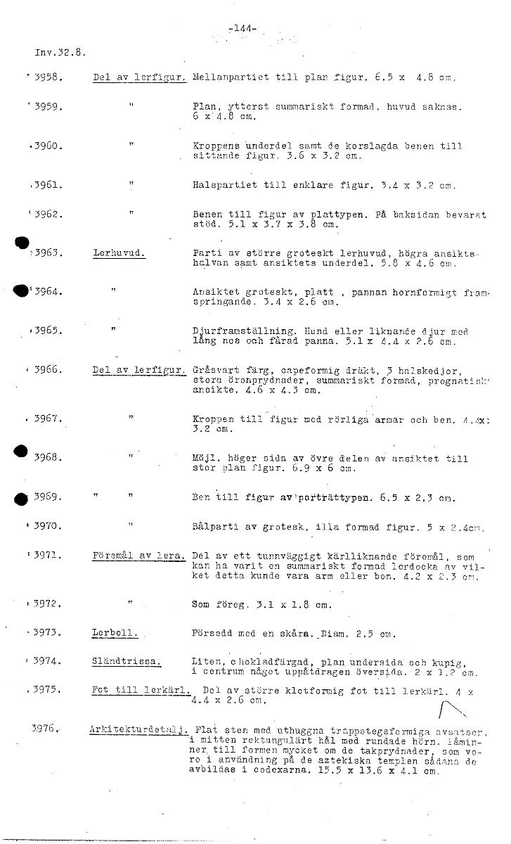 -144 1nv.32.8. " 3958. Del av lerfigur. Mellanpartiet till plan figur. 6.5 x 4.8 cm. 3959. VI Plan, ytterst summariskt formad , huvud saknas. 6 x.4.8 43960. TT Kroppens underdel samt dc korslagda bene...