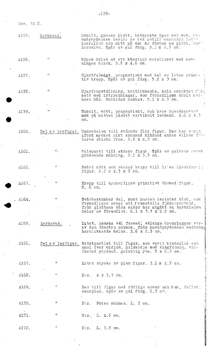 158- Inv. 32.8. 4155. Lerhuvud. Enkelt, ganska platt, intryckta ögon och mun, vudprydnaden består av två intill varandra lerrullar och mitt på dam är fästad en platt, rar' lerskiva. Spår av gul- färg....