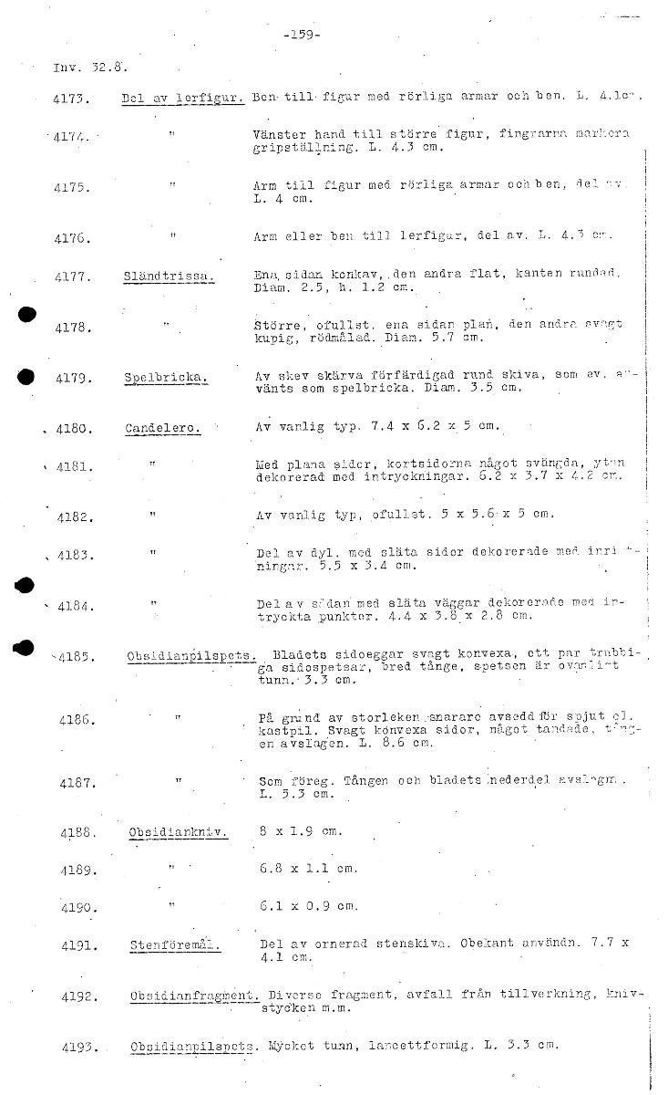 -159- • inv. 4173. Del av lerfiuur. Ben till figur med rörliga armar och ben. L. 4174. Vänster hand till större figur, fingrarna malter. gripställning. L. 4.3 cm. 4175. 1T till figur med rörliga armar...