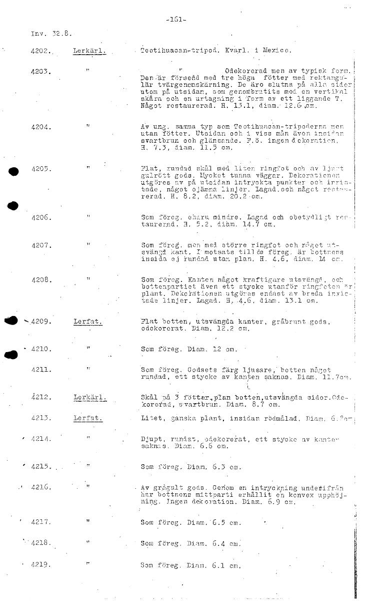 -161- Inv. 32.8. 4202., Lerkär Teotihuacan-tripod. Kvarl. i Mexico. 4203. TT °dekorerad men av typisk form. Den :är försedd med tre höga fötter med rektangu- lär tvärgenomskärning. De äro slutna TA al...