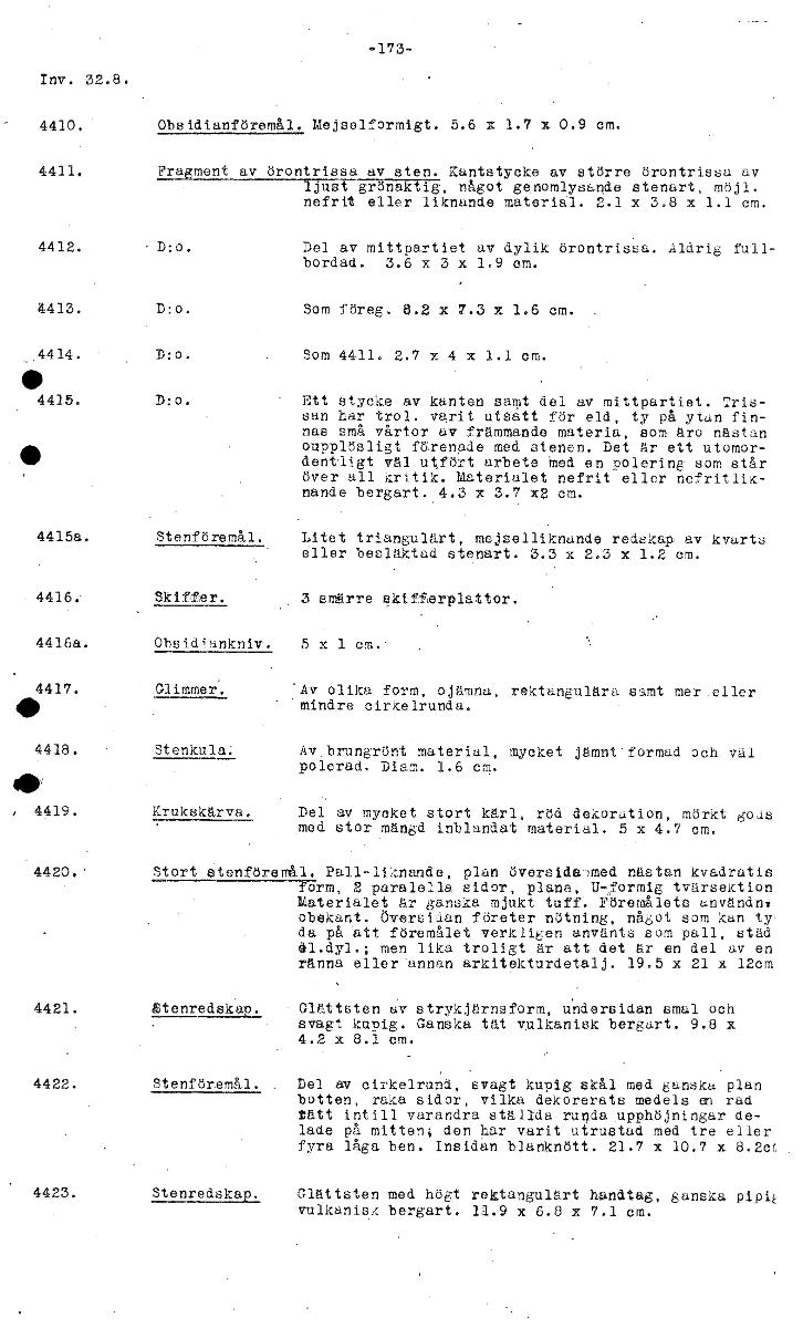-173- Inv. 32.8. 4410, Obsidi nföremäl. Mejselformigt. 5.6 x 1.7 x 0.9 cm. 4411. Fragment av örontrissa av sten. Kantstycke av större örontrissu av ljust grönaktig, något genomlysande stenart, möjl. n...