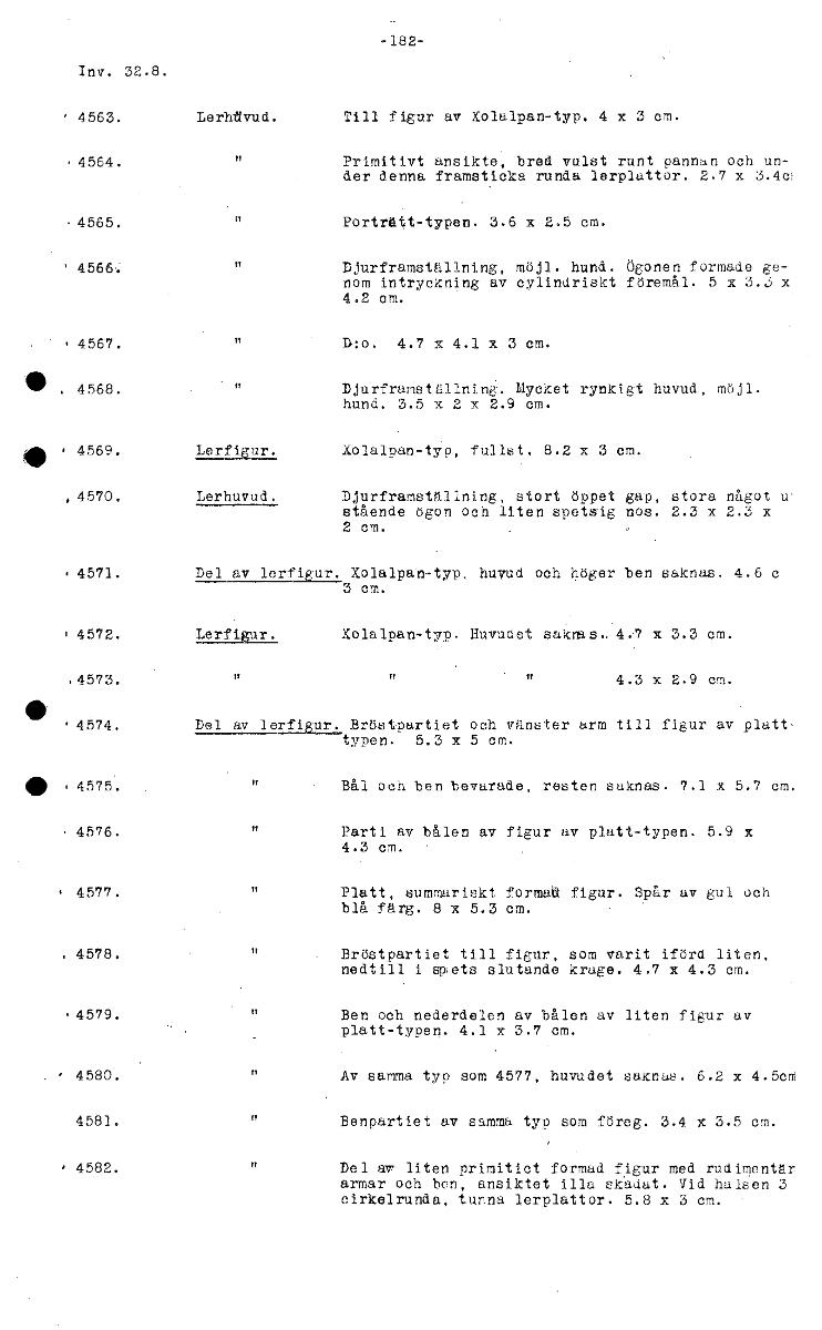 -182- Inv. 4563. Lerhtvud. Till figur av Xolalpan-typ. 4 x 3 cm. 4564. Primitivt ansikte, bred vulst runt pannan och un- der denna framsticka runda lerplattor. 2.7 x 4565. Porträtt-typen. 3.6 x 2.5 cm...