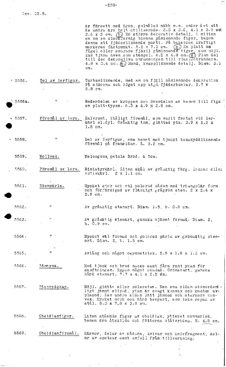 -238- Inv. 32.8. är försett med ögon, gulmåltid näbb m.m. under det att de andra äro helt stiliserade. 3.3 x 3.6, 4.1 x 3.9 och 3.6 x 3 cm. Cp En större dekorativ detalj, i mitten en om en kloc formig blomma påminnande figur, bakom denna ett fjäderliknande parti. På baksidan kraftigt markerad fästpunkt. 5.2 x 7.1 cm. cgu En platt om fågel eller snarare fjäril påminnande figur, som möjl. kan tjäna även som stämpel. 4.2 x 4.8 cm. Plan del till den dekorativa omramningen till rök_elsebrännare. 4.8 x 3.4 cm. GRund, knappliknande detalj. Diam. 3.1 cm. 5556. Del av lerfigur. Turbanliknande, med en om fjåll påminnande dekoration På sidorna och högst upp utgå fjäderbuskar. 5.7 x 5.8 cm. 5556a. nederdelen, av kroppen och överdelen av benen till figu av platt-typen. 6.3 k 4.9 x 2.8 cm. 5557. Föremål av lera. Halvrunt, ihåli t föremål, som varit fästat vid ler- kärl el.dyl. Gråaktig ton, glättad yta. 3.9 x 2.2 x 1.5 cm. 5558. Del av lerfigur, ena benet med tjockt benskyddliknande föremål på framsidan. L. 32 cm. 5559, Mollusk. Melongena patula Brod. dc Sow. 5560. Föremål av ler Miniatyrkärl. Liten skål av gråaktig färg, leksak eller votivkärl. 2 x 1.1 cm. 5561. Stenpärla, Mycket stor och vål polerad sådan med triangulär form och förfärdigad av fläckigt grågrön sten. 2 x 2.4 x 4 2.8 cm. 5 5 62. Av gråaktig stenart. Diam. 1.5, h. 0.8 em- 41' 5563. Av gråaktig stenart, ganska ojämnt formad,. Diam. 2, h. 0.9 cm. 5564. Mycket väl .formad och polerad pärla av grönaktig sten- art. Diam. 2, h. 1.5 cm. 5565. Avlång och något ()Symmetrisk. 2.5 x 1.8 x 1.3 cm. 5566. Med tjock och bred nacke samt fåra runt yxan för skattningen. Eggen något skadad. Grönsvart, ganska hård stenart. 7.7 x 4.1 x 2.2 dm. 5567. Stenredskap. Möjl. glätt- eller polorsteff. Den ena sidan utomordent- ligt jämnt slip,1d, ytan är svagt konvex och kantax av- planad; den andra sidan lätt jämnad och starkare kon- vex. Mycket mörk och hård bergart, som icke repas av stål. 8.3 x 7.8 x 3.8 cm. 5568. Obsidianfigurt. Liten stående figur av obsidian, ytterst summarisk, benen äro åtskilda och fötterna utåtvridna. H. 4.8 cm. 5569. Obsidianföremål. Kärnor, delar av sådana, knivar och knivfragment, del- ar av spetsar samt avfall från tillverkning. [ocr]