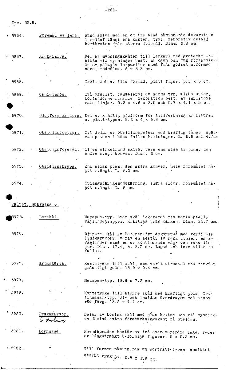 -262- Inv. 32.8. k 5966. Föremål av lera. Rund skiva med en. om tre blad påminnande dekoration i relief längs ena kanten, trol. dekorativ detalj bortbruten från större föremål. Diam. 2.8 cm. 5967. Krukskerva. Del av mynningskanten till lerkärl med groteskt an- sikte vid mynningen best. ar ögon och mun förfärdigaa .de av pålagda lerpartier samt från godset.utformad näsa, rödmalad. 6 x 3.3 cm. 5968. Trol. del av illa formad, platt figur. 5.5 x 5 cm. 5969. Candeleros. Två ofullst. candeleros av samma typ; släta sidor, kortsidorna rundade, dekoration best. av inristade raka linjer. 5.2 x 4.6 x 3.5 och 5.7 x 4.1 x 3 cm. 5970. Gjutform av lera. Del av kraftig gjutform för tillverkning av figurer av platt-typen. 8.2 x' 4,x 6.8 cm. e 5971. Obsidianspetsar. Två delar av obsidianspetsar med kraftig tånge, själ- va spetsen i båda fallen bortslagen. L. 5.5 och 4.5cff 5972. .0bsidianföremål. 'Liten cirkelrund skiva, vars ena sida år plan, den andra svagt konvex. Diam. 2 cm. 5973. Obsidianskrapa. Ena sidan plan, den andra konvex, hela föremålet nå- got svängt.. L. 9.2 cm. 5974. TrianguläragenoMskårning, elda sidor, föremålet nå- got. svängt. L. .9 cm: • Fältet, skärnin 6. .111)59 7 5. Lerskål. Mazapan-typ. Stor skål dekorerad med horisontella våglinjegruPper,.kraftiga brännmärken. Diam. 25.7 cm.. 5976. Djupare skål ..av Mazapan-typ dekoreraå med vertiaala linjegrupper, varav en består av raka linjer, en av våglinjer samt en av kombinerade våg- och raka lin- jer. Diam. 17.4, h. 8.7 cm. Lagad och icke alldeles fullst. k- 5977. Krukskärva. KantstyCke till skål, som varit utrustad med ringfot gråaktigt gods. 15.2 x 9.6 cm. 5978. Mazapan-typ. 13.8 x 7.2 cm. 5979. Kantstycke till större skål med kraftigt gods, Teo- tihuacan=typ. Ut- och insidan överdragen med djupt röd färg. 13.2 x 7.7 cm. 5980. Krukskärvor. Delar av konisk skål med plan botten och vid .mynning- en fästad extra förstärkningskant på utsidan. 5981. Lerhuvud. Huvudbonaden består av två överavarandra lagda rader av långsträdkt U-formiga figurer. 5 x 5.3 cm. -5982. Till formen påminnande• om porträtt-typen, ansiktet .starkt rynkat, 2.5 x cm. [ocr]