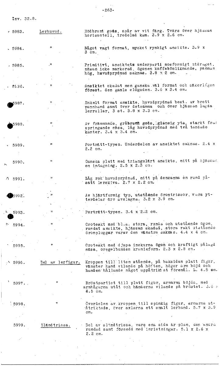 -263- Inv. 32.8. • 5983. Lerhuvud. Rödbrunt gods, spår av vit färg. Tvärs över hjässan horisontell, tredelad kam. 3.9 x 2.6. cm. • 5984. Något vagt format, mycket rynkigt ansikte. 3.9 x 3 cm. 5985. Pr...