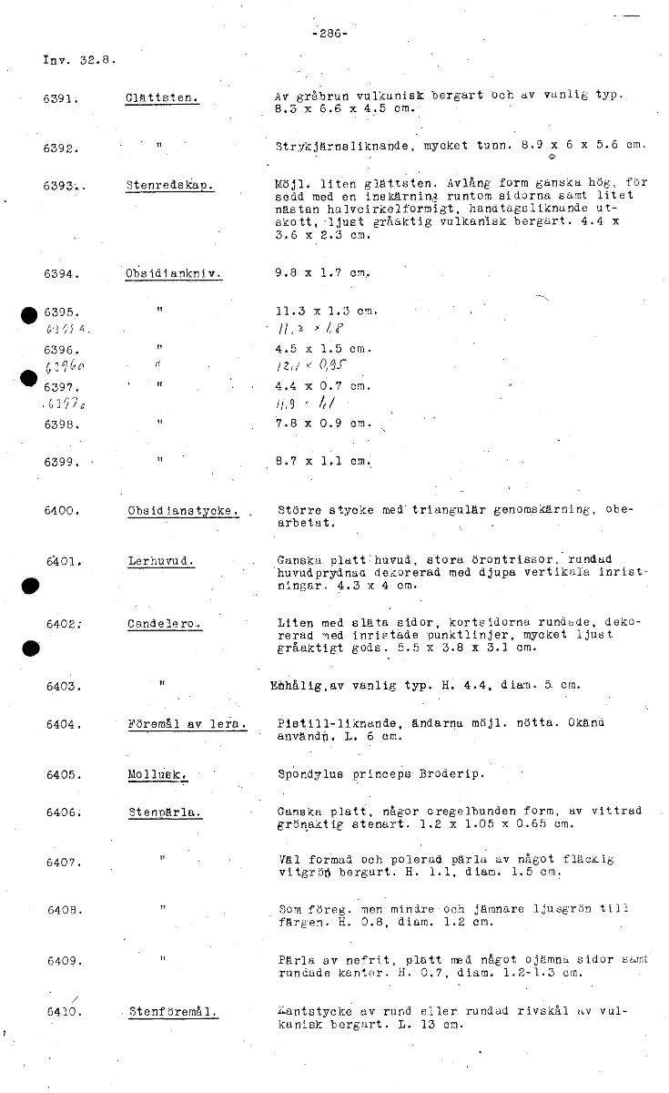 • -286- Inv. 32.8. 6391. Glättsten. Av gråbrun vulkanisk bergart Och av vanlig typ.. 8.3 x 6.6, x 4.5 cm. 6392. Strykjärnsliknande, mycket tunn. 8.9 x 6 x 5.6 cm. 6393.. Stenredskap. Möjl. liten glättst... Visa hela