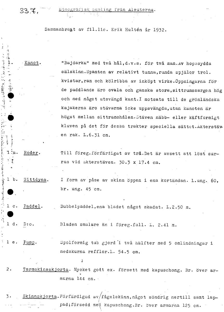 Etnograris, :Jamling från Aleuterna. Sammanbragt av fil.lic. Erik Hultén år 1932. . Kanot. "Bajdarka" med två hål,d.v:s. för två man.Av hopsydda sälskinn.Spanten av relativt tunna,runda spjälor trol. kvistar,ram och kölribba av inköpt virke.Öppningarna för de paddlande äro ovala och ganska stora,sittrumssargen hög och med något utsvängd kant.I motsats till de grönländska kajakerna äro stävarna icke uppsvängda,utan kanoten är högst mellan sittrumshålen.Stäven näbb- eller käftformigt kluven på det för desSa trakter speciella sättet.Akterstäv- en rak. L.6.31 cm. :a. Roder. Till föreg.förfärdigat av trå.Det är avsett att löst sur- - . ras vid akterstäven. 30.3 x 17.4 cm. 1 Sittdyna. I form av påse av skinn öppen i ena kortändan. L.ung._ 60, br. ung. 45 cm. 1 Paddel. Dubbelpaddel,ena bladet något skadat. L.2.50 m. 1 D:o. Bladen smalare än i föreg.fall. L. 2.41 m. 1 Pamp. Spolformig tub gjord i två hälfter med 5 omlindningar i nedskurna refflor.L. 54.5 cm. 2. Tarmskinsskjorta. Mycket gott ex. försett med kapuschong_. Br. över ar- . marna 144 cm. .Skinnskjorta.Förfärdigad av fågelskinn,något söndrig nertill samt lap- pad;försedd med kapuschong.Br. över armarna 125 cm. [ocr]