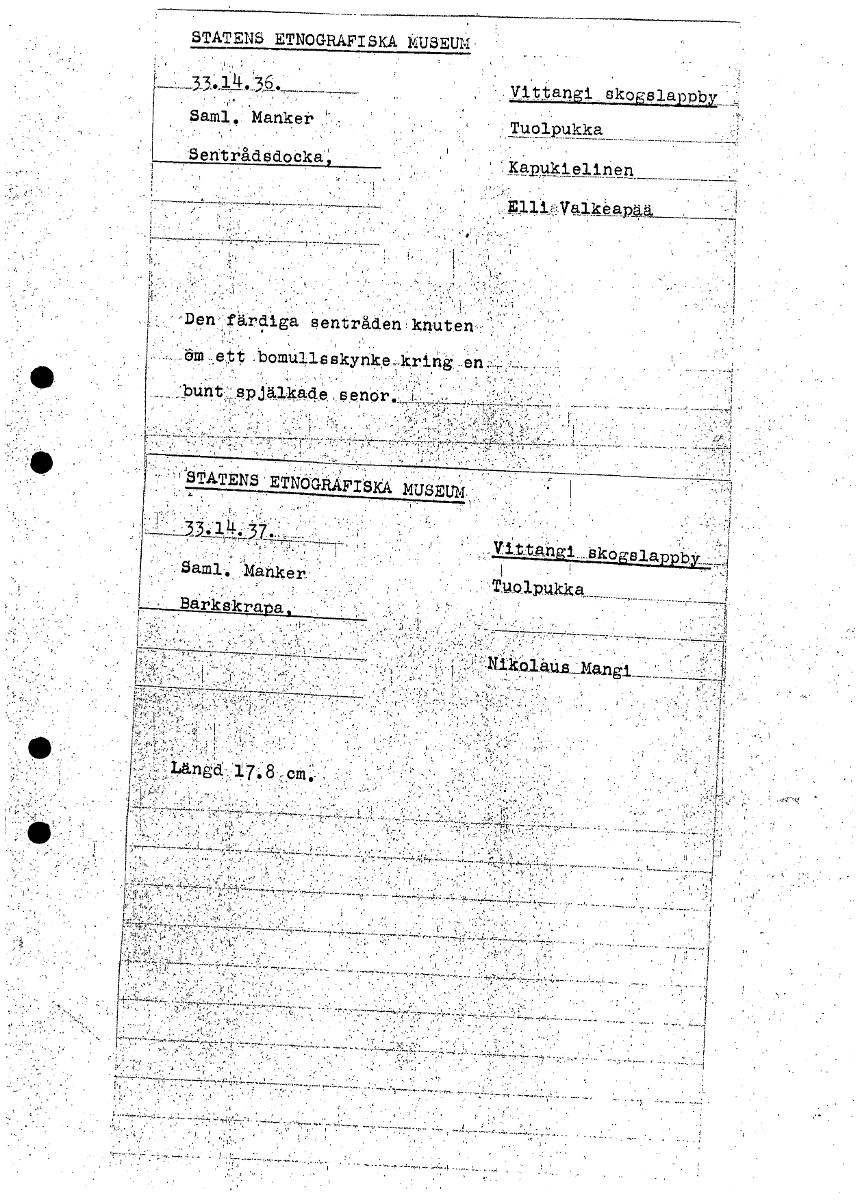 • STATENS ETNOGRAFISKA MUSEUå VlttRngl_PkoEgaaPpinr____ Tuolpukka Kapukielinen enfårdiga eentråden knuten m ett _bomu lsskynke - n 'd crn. [ocr]