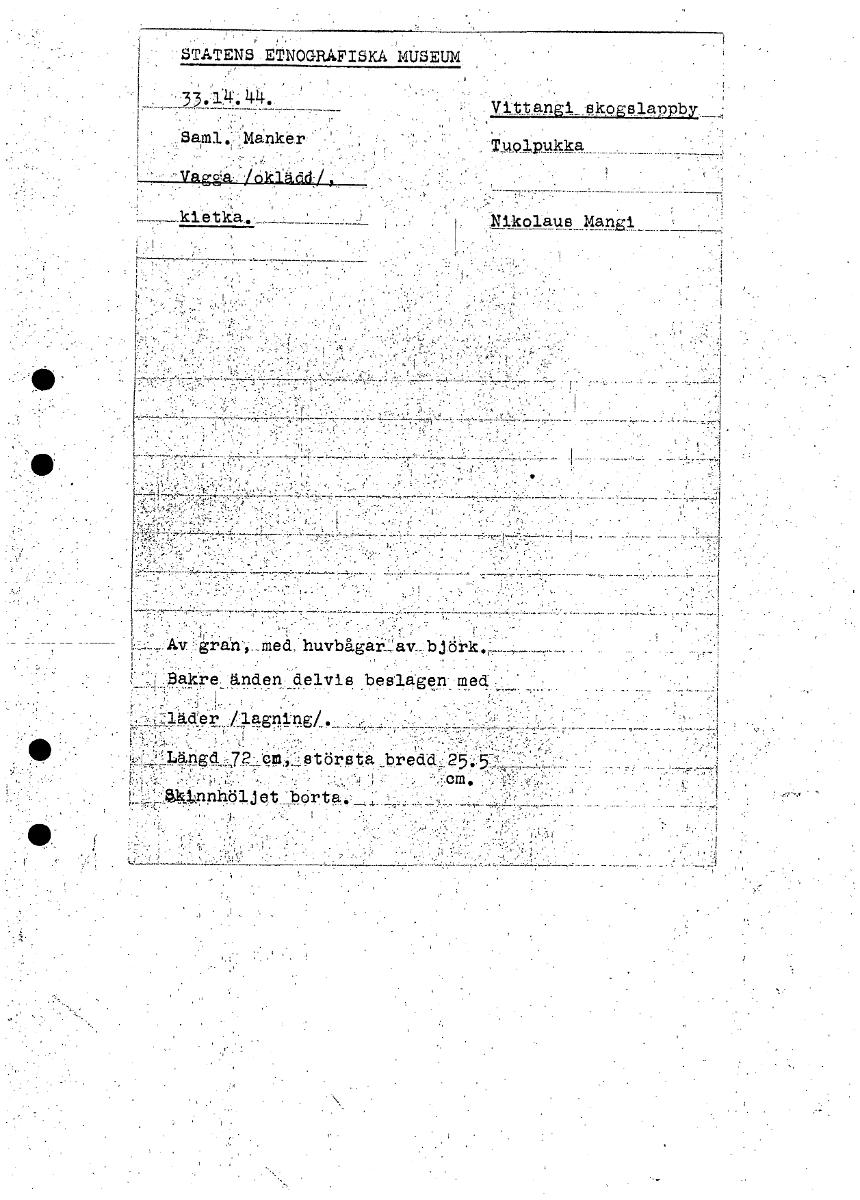 • STATENS ETNOGRAFISKA MUSEUM Vitt angi_ skogslappby____ T lpukka Vikolaus Mangi Av gran-, med, huvbågar2 av_ bjårk.,-- Bakre änden delvis beslagen_ med nhöli et 'Oorta.__, [ocr]