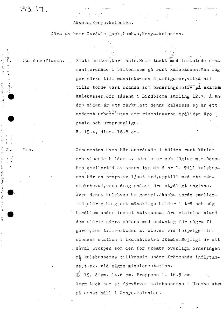 33 .11 Akamba,Kenya,kolonien. Gåva av herr Cardale Luck,Lumbwa,Kenya-kolonien. KalebassflaSka. Platt botten,kort hals.Helt täckt. med inristade orna- ment, ordnade i bälten, som gå runt kalebassen.Man...