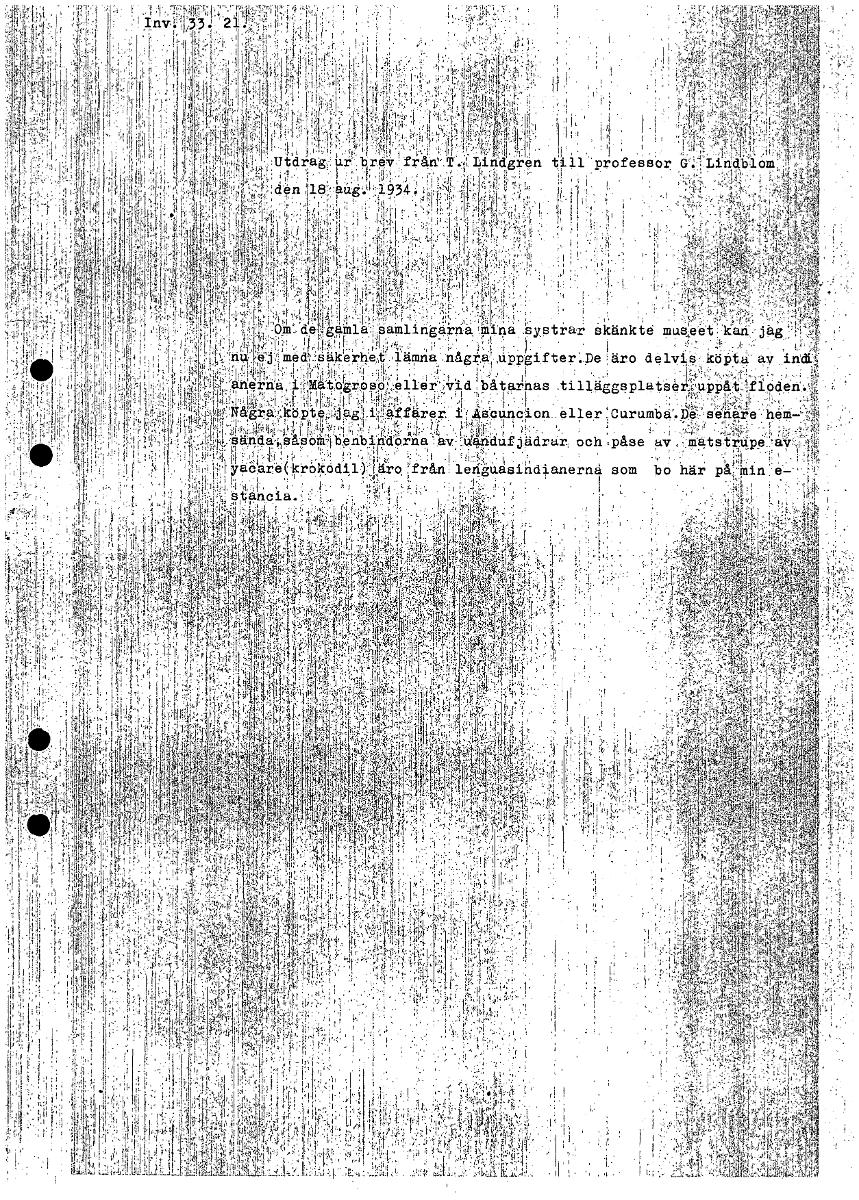 Om de gamla samlingarna mina systrar skänkte museet kan jag nu ej med säkerhet lämna några uppgifter. De äro delvis köpta av indianerna i Matogrosso eller vi båtarnas tilläggsplatser uppåt floden. Några köpte jag i affärer i Accuncion eller Curumba. De senare hemsända såsom benbindorna av fjädrar och påse av matstrupe av yacare (krokodil) äro från lenguasindianerna som bo här på min estancia.