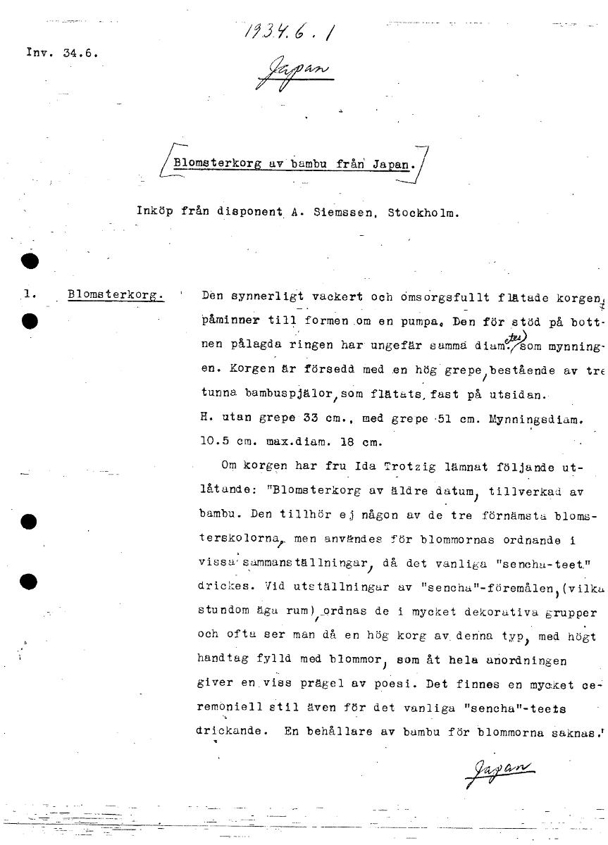 Inv. 34.6. Blomsterkorg av bambu från Japan. Inköp från disponent A. Siemssen, Stockholm. 1. Blomsterkorg, Den synnerligt vackert och omsorgsfullt flätade korge5 påminner till formen om en pumpa, Den ...Visa hela