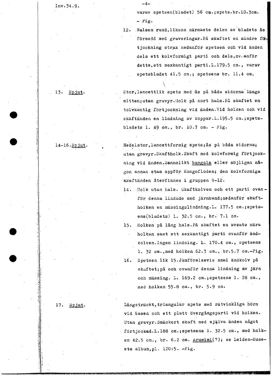Inv.34.9. -4- varav spetsen(bladet) 56 cm.;spets.br.10.3cm. - Fig. 12. .Halsen rund,liksom närmaste delen avhladets ås försedd med graveringar.På skaftet en mindre fiit, tjockning strax nedanför spetsen och vid änden dels ett kolvformigt parti och dels,oV-anför detta,ett sexkantigt parti.L.179.5 cm., varav spetsbladet 41.5 cm.; spetsens br. 11.4 cm. Spjut._ Stor,lancettlik spets med ås på båda sidorna•längs mitten;utan gravyr.Holk på kort hals.På skaftet en tolvkantig förtjockning vid änden.Vid holken och vid skaftänden en lindning av koppar.L.195.5 cm.;spets- bladets 1. 49 cm., br. 10.7 cm. - Fig. 14-16.Spjut. Medelstor,lancettformig spets;ås på båda sidorna; utan gravyr.Skaftholk.Skaft med kolvformig förtjock- ning vid änden.Sannolikt bangala eller möjligen nå- gon annan stam uppför Kongofloden; den kolvformiga skaftänden återfinnes i gruppen 9-12. 14. •Holk utan hals. Skaftkolven och ett parti ovan- för denna lindade med järnband;nedanför skaft- holken en mässingslindning.L. 177.5 cm.;spets- ens(bladets) 1. 32.5 cm., br. 7.1 cm. 15. Holken på lång hals.På skaftet en avsats nära holken samt ett sexkantigt parti ovanför änd- kolven.Ingen lindning. L. 170.4 cm., spetsens 1. 32 cm.,med, holken 62.3 cm., br.5.7 cm.-Pig. 16. Spetsen lik 15.Jämförelsevis smal ändkolv på skaftet;på och ovanför denna lindning av järn och mässing. L. 169.2 cm.;spetsens 1. 28 cm., med holken. 55.8 cm., br. 17. Spjut. Långsträckt,triangulär spets med rätvinkliga hörn vid och ett platt övergångsparti vid holken. Utan gravyr.Smäckert skaft med själva änden något • förtjockad.L.188 cm.;spetsens 1. 32.5 cm., med holk- en 42.5 cm., br. 6.2 cm. Aruwimi(?); se Leiden-Muse- ets album,pl. 120:5. Fig. [ocr]