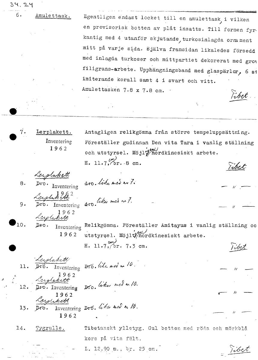 6. Amulettask. Egentligen endast locket till en amulettask i vilken en provisorisk botten av plåt insatts. Till formen fyr. kantig med 4 utanför skjutandeiturkosinlagda oralment mitt på varje sida. Själva framsidan likaledes försedd med inlagda turkoser och mittpartiet dekorerat med groi filigrans-arbete. Upphängningsband med glaspärlor, 6 si imiterande korall samt 4 i svart och vitt. Amulettasken 7.8 x 7.8 cm. 7-ae"e 7. Lerplakett. Antagligen relikgömma från större tempeluppsättning. 11, Inventerinc, Inventering Föreställer gudinnan Den vita Tara i vanlig ställning 1962 och utstyrsel. Möjlltördkinesiskt arbete. H. 11.7,r. 8 cm. 4579-6,41,4t 8. »ro. Inventering h 19 2 9. Prt. Inventering d'rt,) • 1962 • 1O. Inventering Relikgömma. Föreställer Amitayus i vanlig ställning oc 1962 utstyrsel. Möjl*nordkinesiskt arbete. e»,y) v-t • H. 11.7,/br. 7.3 cm. 11. ,1)-=-6 • in ven terin g 1962 12. p-K). Inventering 1962 44)6e 1 3 # P-o. Inventering 1962 14. Tygrulle. Tibetanskt ylletyg. Gul botten med röda och mörkblå kors på vita fält. L. 12. 90 m., L-g. 25 cm. [ocr]