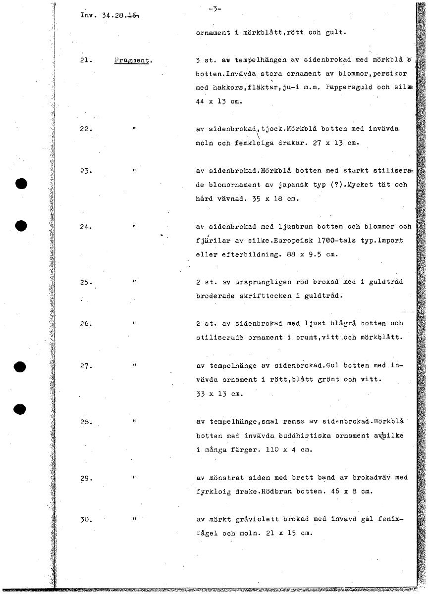 Inv. ornament i mörkblått,rött och gult. 21'. Fragment. 3 st. av tempelhängen av sidenbrokad med mörkblå b botten.Invävda stora ornament av blommor,persikor med hakkors,fläktar,ju-i m.m. Pappersguld och sille 44 x 13 cm. av sidenbrokad,tjock.Mörkblå botten med invävda mäln och femkloiga drakar. av sidenbrokad.Mörkblå botten med starkt stilisera, • de blomornament av japansk typ (?).Mycket tät och hård vävnad. av sidenbrokad med ljusbrun botten och blommor och fjärilar av silke.Europeisk 1700-tals typ.Impor.t eller efterbildning. 88 x st. av ursprungligen röd brokad med i guldtråd broderade skrifttecken i guldtråd: 2 st. av sidenbrokad med ljust blågrå botten och stiliserade ornament i brunt,vitt..och mörkblått. • av tempelhänge av sidenbrokad.Gul botten med in- vävda ornament i rött,blått grönt och vitt. • av tempelhänge,smal remsa av sidenbrokad.Mörkblå' botten med invävda buddhistiska ornament av/silke i många färger. 110 29. av mönstrat siden med brett band av brokadväV med fyrkloig drake.Rödbrun botten. 46 x 8 cm. av mörkt gråviolett brokad med invävd gål fenix- lågel och moln. 21 x 15 cm. [ocr]