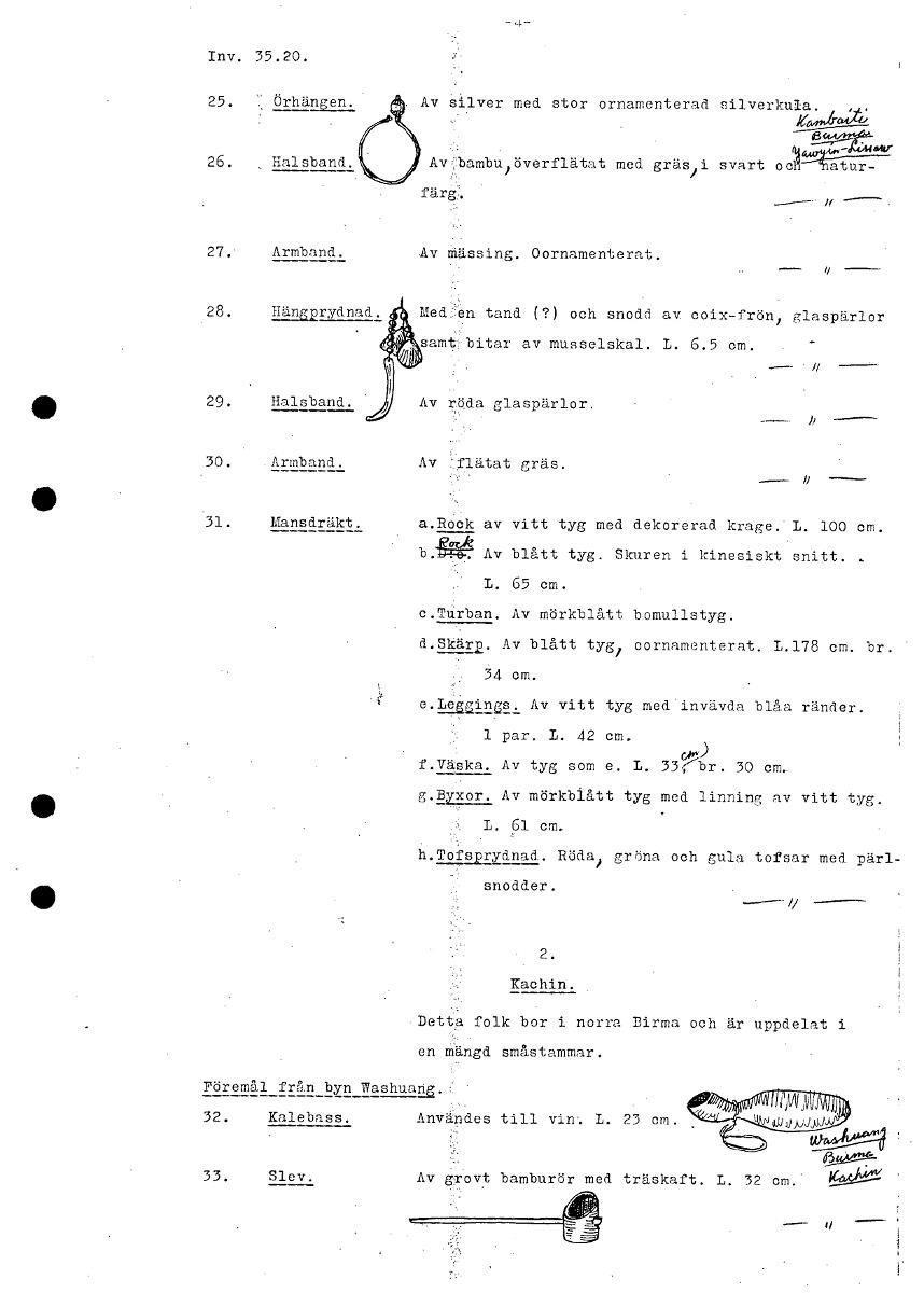 Inv. 35.20. 25. Örhängen. ar. Av silver med stor ornamenterad silverkula. g eX 915<0 4A0104,2giittfr 26. Halsband. AvbambU,överflätat med gräs»i svart oc11--ur- 27. Armband. Av mässing. Oornamenterat....
