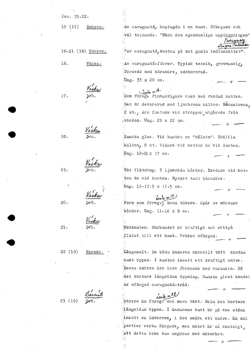 • Inv. 35.22. (17) Snören. Av caraguatå7 hoplagda i en bunt. Ofärgade och .väl tvinnade. "Märk den egendomliga uppläggningen" Pa~±..CAL 16-21 (18) Väskor. "Av caraguatå)knutna på det gamla indiansättet"... Visa hela