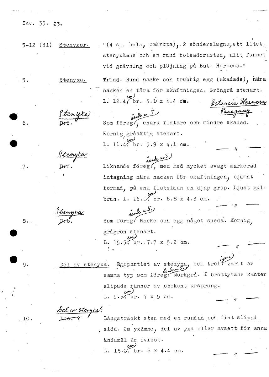 Inv. 35. 23, 512 (31) Stenyxor. "(4 st. hela/ omärkta)).2 sönderslagna ett litet• stenyxämne och en rund boleadorasten1 allt, funnet vid grävning och plöjning på Est. Hermosa.fl 5. Stenyxa. Trind..Run...Visa hela