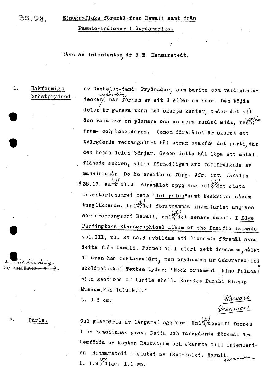 35,2x Etnografiska föremål från Hawaii samt från Pawnie-indianer i Mordamerika. Gåva av intendenten dr D.E. Hammarstedt. 1. Hakformie av Caohept-tand. Prydnader,/ som burits som värdighets- a") A.r1-04,""1 bröstprydnad. teeker har i formen av ett J eller en hake. Len böjda delen är ganska tunn med skarpa kanter) under det att likden raka har en planare och en mera rundad sida resp? fram- och baksidorna. Genom föremålet är skuret ett 11/ tvärgående rektangulärt hål strax ovanför-det partildär den böjda delen börjar. Genom detta hål löpa ett antal flätade snören vilka förmodligen äro förfärdigade av människohår. De ha svartbrun färg. Jfr. inv. Vanadis 438.17. samt` 41.3. Föremålet uppgives en19tdet sista inventarienumret heta "lei palau"samt,beskrives såsom tungliknande. Enr97Ydet förstnämnda inventariet angives som ursprungsort Hawaii/ enl det senare Kauai. I Edge Partingtons Ethnographical Album of the Pacific Islands 11/ vol.III pi. 22 no.8 avbildas ett liknande föremål ävem detta från Hawaii. Formen är i stort sett densamma hålet 111 är även här rektangulärt) men prydnaden är dekorerad med Se~1~,-2-7--e. sköldpaddskal.Texten lyder: "Beck ornament (Minn Palaca) with sections of turtle shell. Bernice Pauahi Bishop Museum,Honolulu.1\1.1." L. 9.5 cm. 2. Pärla. Gul glaspärla av långsmal äggform. Enitgppgift funnen i en hawaiiansk grav. Detta och föregående föremål äro hemförda av kapten Bäckström och skänkta till intendent- en Hammarstedt i slutet av 1890-talet. Hawaii. a L.2 1.9,(diam. 1.1 an. [ocr]