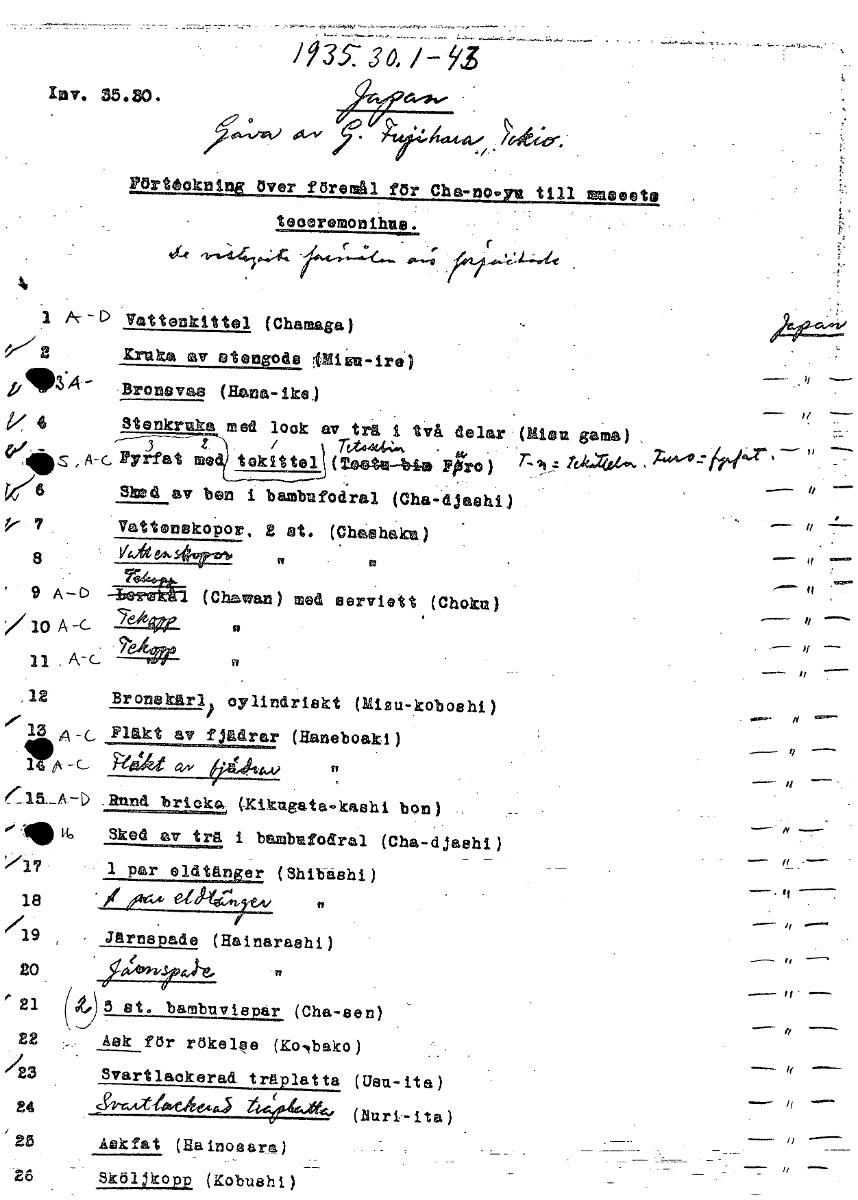 335.- 3a 1- 53 %iv, "44-1 1~ 9~ - f Pörteokningver föremål för Cha-no' till =eget@ teooremonihus. 1 /4T- -D Vattenkittel (Chamaga) 2 Kruka glv stenelt MiSta ire) p1103 -Bronevas (Hana-ike) k 4 Stenkruka med look av trå i två delar - (Mien gama) z rt.t444:•". r Z.94-4-76942.' " , Ac Pyrfat me tekittel (Teate—bla Ppro ) Lvm1~-- , k/6 Sked av ben i bambufodral (Cha-djaehi) P' 7 VattnskoPor, 2 st. (Cheahaku) 8 Votte4s4orrot4 ' 9 A-D (Cha an) med eerviett(Choku) /10 A-c YA—kW- 11 , A-c ''nve ,12 Bronekärl oylindriskt (Mizu-koboshi) Fläkt av fjädrar (:uwboaki.) 1111! OduAi Rund hr. OKikgat-kashi bon) Iglo 1,6 Sked av trå i bambuiodr1 (Cha-djashi) Y/7. • lE42.1.(2213j_g_t n e r((Shibashi) 18 ea4554tt 69 därnsPade (Hainarashi) 20. 7450,,A4 21 0155 st, bambuvis år (Cha-sen) 22 Ask för rökelee (Ko.,bako) /23 Svartlaokerad• träplatta (0su-ita) 24 44(00.4-#4, (Bu r i ta ) / 25 Askfat (Hainosara) 26 Sköljkopp (Kobushi) [ocr]