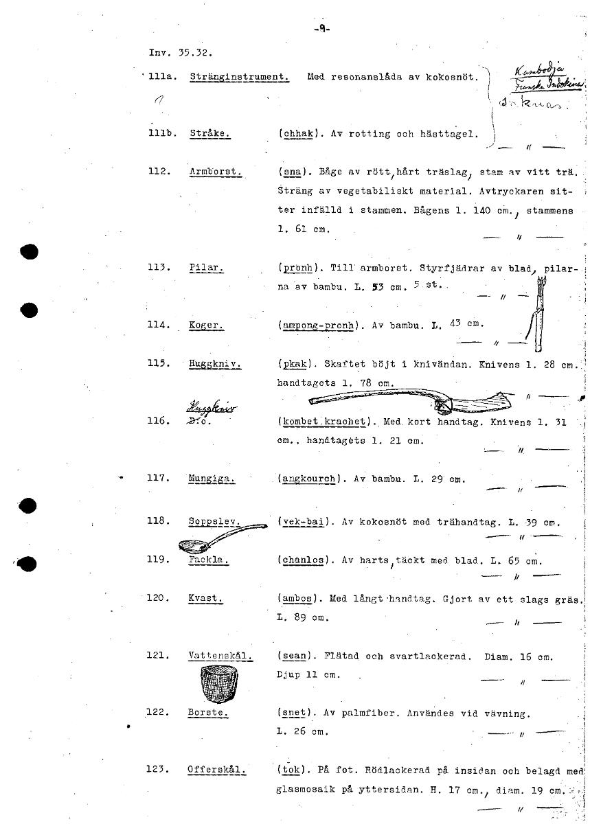 -q- Inv. 35.32. '111a. Stränginstrument. Med resonanslåda av kokosnöt. 47110V-~« (7 111b. Stråke. (chhak). Av rotting och hästtagel. 112. Armborst. (sna). Båge av rött hårt träslag stam av vitt trä.. Sträng av vegetabiliskt material. Avtryckaren sit- ter infälld i stammen. Bågens stammens 1. 61 cm. 113. Pilar. (pronh). Till. armborst. Styrfjädrar av blad/ pilar—i • na av bambu. L. 53 cm. 5 st.. 114. Koger. (ampong-pronh). Av bambu. L. 43 cm. 115. Huggkniv.(ykak). Skaftet böjt i knivändan. Knivens 1. 28 cm.. handtagets 1. 78 cm. 116. 1KU. (kombet krachet).. Med kort handtag. Knivens 1. 31 cm., handtagets 1. 21 cm. 117. Muuiga. angkourch). Av bambu. L. 29 cm. 118. Soppslev. (vek-bai). Av kokosnöt med trähandtag. L. '39 cm. .r-- 119. Fackla. (chanlos). Av harts täckt med blad. L. 65 cm. -__. 120. Kvast. (ambos). Med långt handtag. Gjort av ett slags gräs L.' 121. Vattenskål. (sean). Flätad och svartlackerad. Diam. 16 cm. Djup 11 cm. 122. Borste. (snet). Av palmfiber. Användes vid vävning. • L. 26 cm. 123. Offerskål. • - (tok). På fot. Rödlackerad på insidan och belagd med! glasmosaik på yttersidan. H. 17 cm. diam. 19 cm.. I/ [ocr]Stäng
