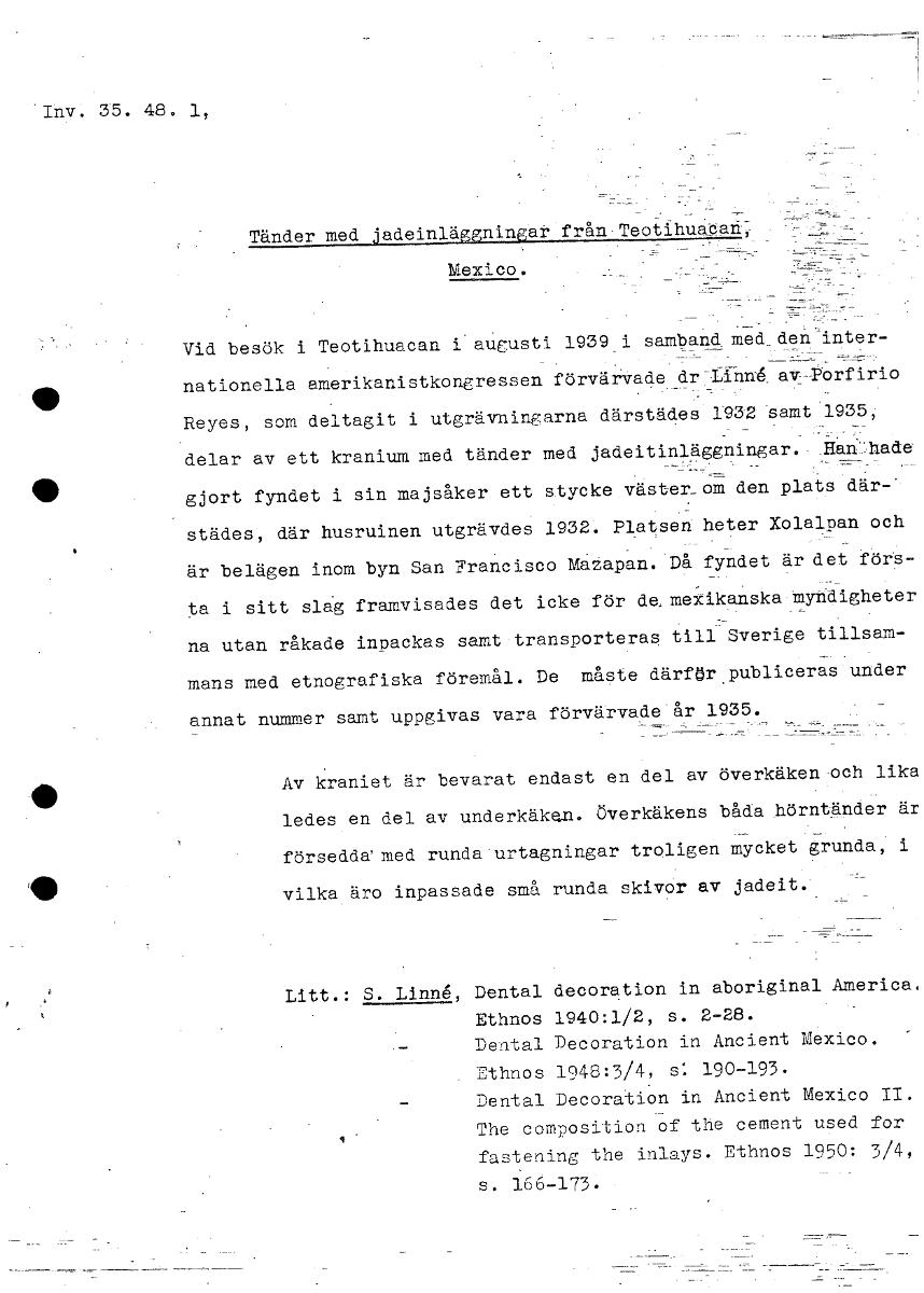 Inv. 35. 48. 1, Tänder med jadeinläggningar från-Teotihuaeat-7,: Mexico. Vid besök i Teotihuacan i augusti 1939 i samband med den inter- nationella amerikanistkongressen förvärVade av-Porfirio Reyes, som deltagit i utgrävningarna därstädes 1932 -samt '1935, delar av ett kranium med tänder med jadeitinläggningar.- _HarLhade gjort fyndet i sin majsåker ett stycke väster_om den plats där- städes, där husruinen utgrävdes 1932. Platsen heter Xolalpan och är belägen inom byn San Francisco Mazapan. Då fyndet är det förs- ta i sitt slag framvisades det icke för demeXikanska myndigheter na utan råkade inpackas samt transporteras till Sverige tillsam- mans med etnografiska föremål. De måste därför publiceras under annat nummer samt uppgivas vara förvärvade år 1935. Av kraniet är bevarat endast en del av överkäken-och lika ledes en del av underkäkan. Överkäkens båda hörntänder är försedda' med runda-urtagningar troligen mycket grunda, vilka äro inpassade små runda skivor av jadeit. Litt.: S. Linné, Dental decoration in aboriginal America, Ethnos 1940:1/2, s. 2-28. Dental Decoration in Ancient Mexico. . Ethnos 1948:3/4, s: 190-193. Dental Decoration in Ancient Mexico II. The composition of the cement used for fastening the inlays. Ethnos 1950: 3/4, s. 166-173. [ocr]