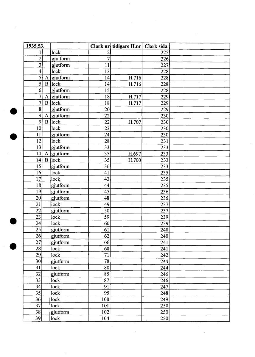 • 1935.53. Clark nr tidigare H.nr Clark sida 1 lock 2 225 2 gjutform 7 226 3 gjutform 11 227 4 lock 13 228 5 A gjutform 14 H.716 228 5 B lock 14 H.716 228 6 gjutform 15 228 7 A gjutform 18 H.717 229 7 B lock 18 H.717 229 8 gjutform 20 229 9 A gjutform 22 230 9 B lock 22 H.707 230 10 lock 23 230 11 gjutform 24 230 12 lock 28 231 13 gjutform 33 233 14 A gjutform 35 H.697 233 14 B lock 35 H.700 233 15 ... Visa hela