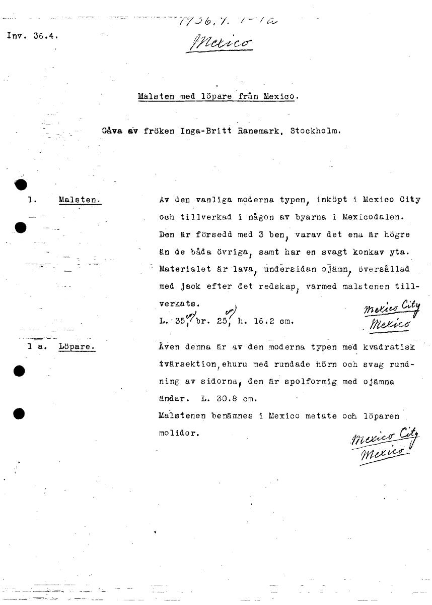 inv. 36.4. Malsten med löpare från Mexico. Gåva av fröken Inga-Britt vanemark, Stockholm. 1. Malsten. Av den vanliga moderna typen inköpt i Mexico City och tillverkad i någon av byarna i Mexicodalen. ...Visa hela