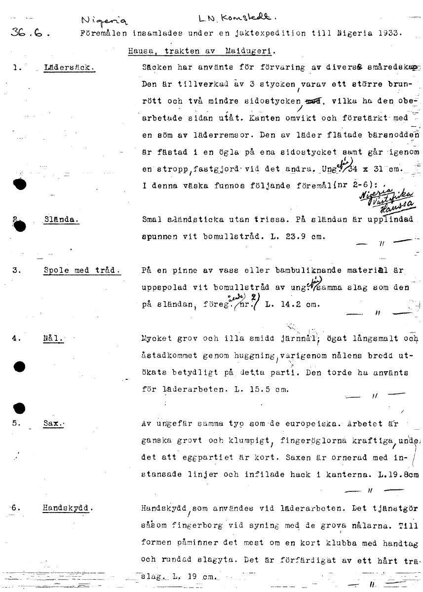 LIK),Koh".%k4a.Ä9L. Föremålen insamlades under en jaktexpedition till Nigeria 1933. Hausa, trakten av Maidugeri. 1. _ Lädersäck. Säcken har använts för förvaring av diverse. småredakaprj Den är tillverkad åv 3 stycken varav ett större brun- rött och två mindre sidostycken , vilka ha den obe= arbetade sidan utåt. Kanten omvikt och förstärkt-med en söm av läderremsor. Den av läder flätade bärsnodden är fästad i en ögla på ena sidostycket samt går igenom en stropplfastgjord.vid det andra. Ung944 x 31 cm. I denna väska funnos följande föremål(nr 2-6): 41( Slända. Smal sAändsticka utan trissa. På sländan är upplindad spunnen vit bomullstråd. L. 23.9 cm. 3. Spole med tråd. På en pinne av vass eller bambuliknande materi.21 är_ uppspolad vit bomullstråd av ung9amma slag som den på sländan föreg 9.4:4;t, L. 14.2 cm. 4. Bål.- Mycket grov och illa smidd järnnål-. ögat långsmalt och åstadkommet genom huggning/varigenom nålens bredd ut- • ökats betydligt på detta parti. Den torde ha använts för läderarbeten. L. 15.5 cm. • 5. Sax., Av ungefär samma tyo som de europeiska. Arbetet ä'r ganska grovt och klumpigt fingeröglorna kraftiga/unde, det att eggpartiet är kort. Saxen är ornerad med in- stansade linjer och infilade hack i kanterna. L.19.8cm 6. Handskydd. Handskydd/som användes vid läderarbeten. Det tjänstgör sålom fingerborg vid syning; med de grova nålarna. Till formen påminner det mest om en kort klubba med handtag och rundad slagyta. Det är ,förfärdigat av ett hårt trä slag.' L. 19 cm, [ocr]