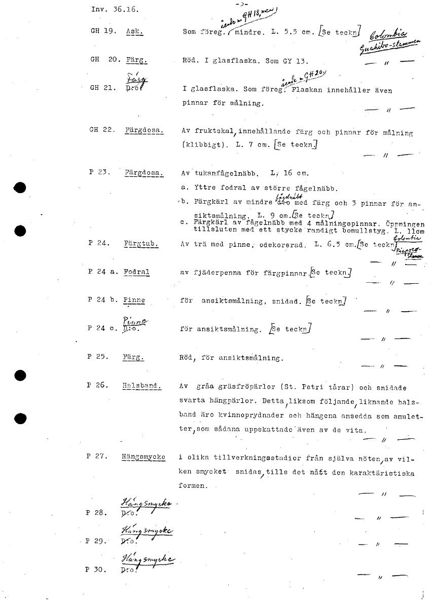 —D- Inv. 36.16. a4081"el)► GH 19. Ask. Som f5reg.T'mindre. 5.5 cm. be teckj GH 20. Färg. Röd. I glasflaska. Som GY 13. -- y #10 GH 21. Drbe I glasflaska. Som föreg: Flaskan innehåller även pinnar för ...Visa hela